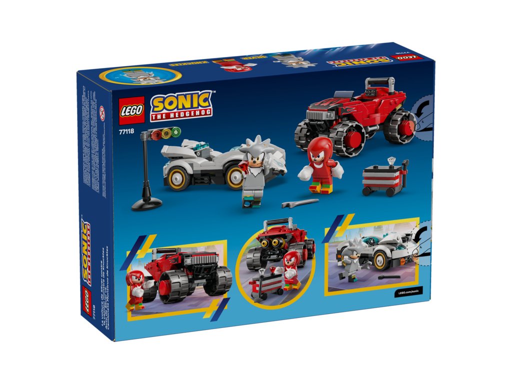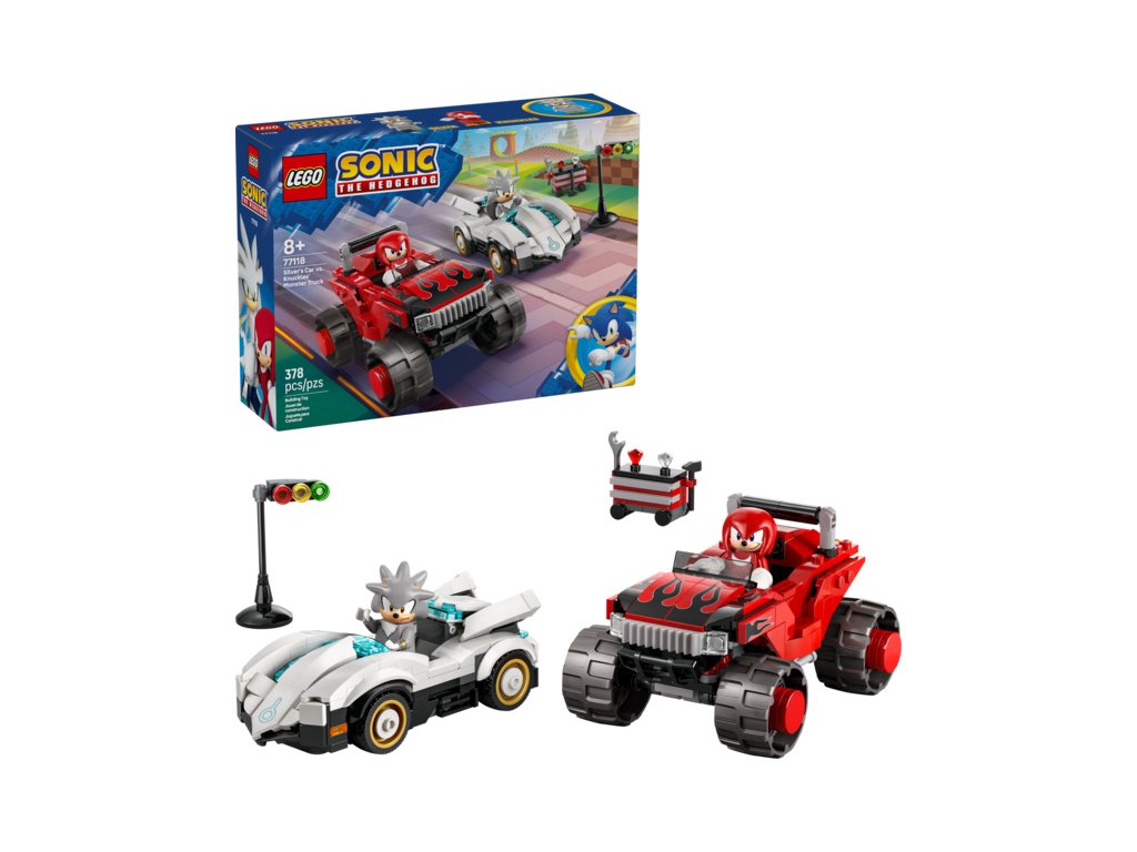 Se stavebnicí LEGO® Sonic the Hedgehog™ Silver a jeho auto vs. Knuckles a jeho monster truck (77118) inspirovanou videohrou se děti od 8 let můžou těšit na hodiny závodění. Tato stavebnice je inspirovaná videohrou Sonic Racing: CrossWorlds pro konzole a milovníci videoher a rychlých aut si s ní užijí závodění společně s minifigurkou Knucklese a první minifigurkou Silvera Hedgehoga.