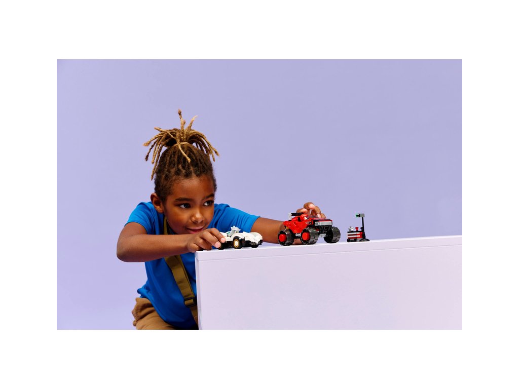 - AKCE JAKO Z VIDEOHRY – Tato závodní stavebnice inspirovaná konzolovou videohrou Sonic Racing: CrossWorlds obsahuje červený a černý monster truck a bílé závodní auto s ploutvemi