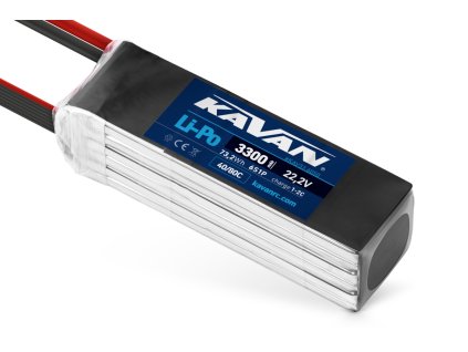 LiPo akumulátorová sada KAVAN se zvýšenou zatížitelností 40/80C, nabíjení až 2C. Šestičlánek 6s1p 22,2V 3300 mAh, rozměry: 138x43x41,5mm, hmotnost: 439g, servisní konektor JST-XH.