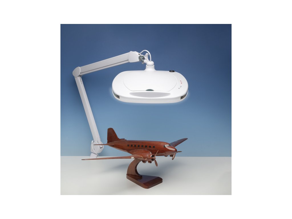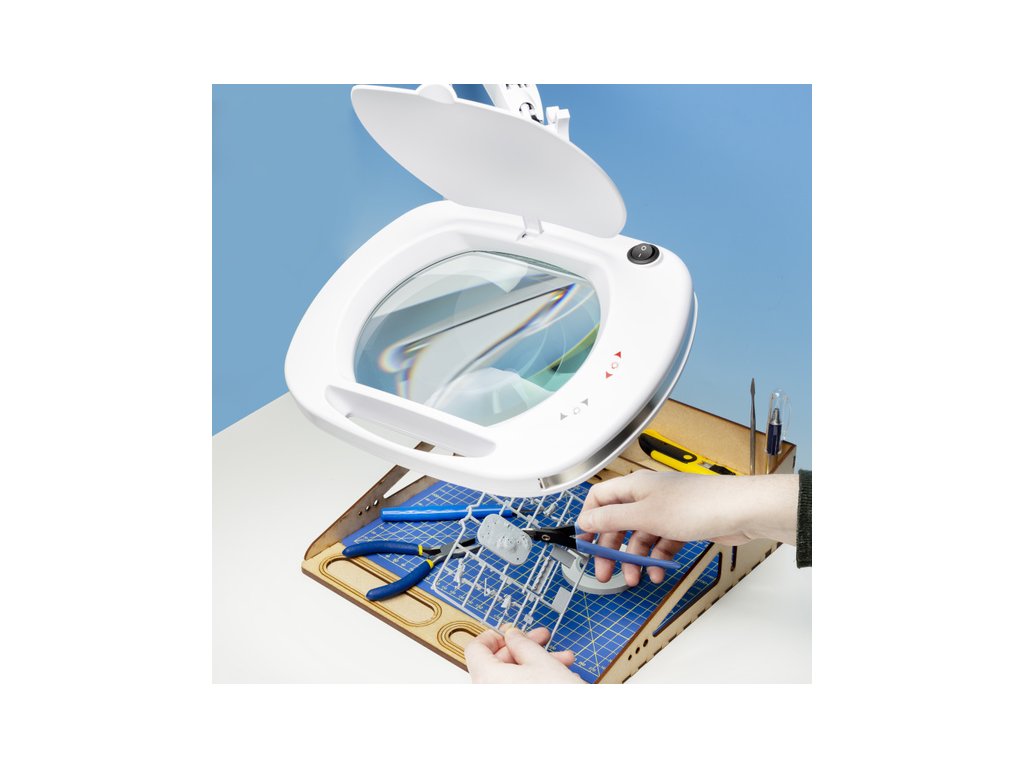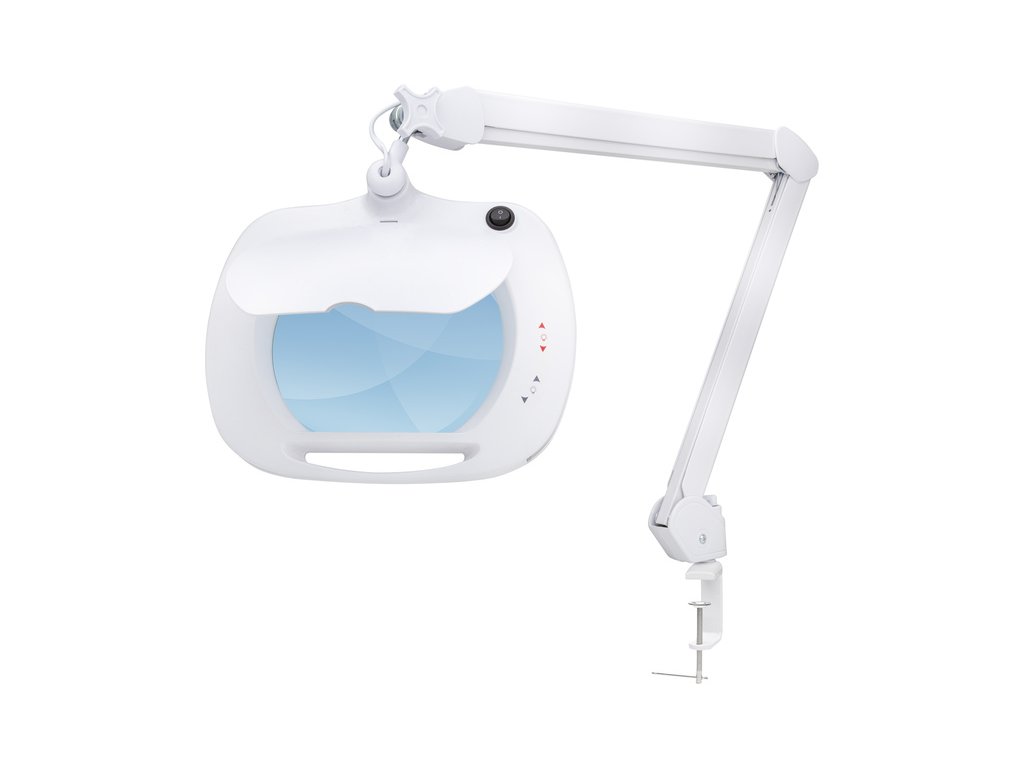 Kvalitní stolní lampa s velkou lupou (zvětšení 1,75 x) o rozměru 15 x 18 cm a LED osvětlením s nastavitelnou intenzitou a teplotou. Ramena a klouby lampy jsou vyrobené z oceli. Díky vestavěným pružinám v ramenech je pozice lampy snadno nastavitelná, lampa sama drží požadovanou pozici. S lampou lze otáčet ve třech osách a vertikálně/horizontálně polohovat. Stolní držák umožňuje její otáčení.