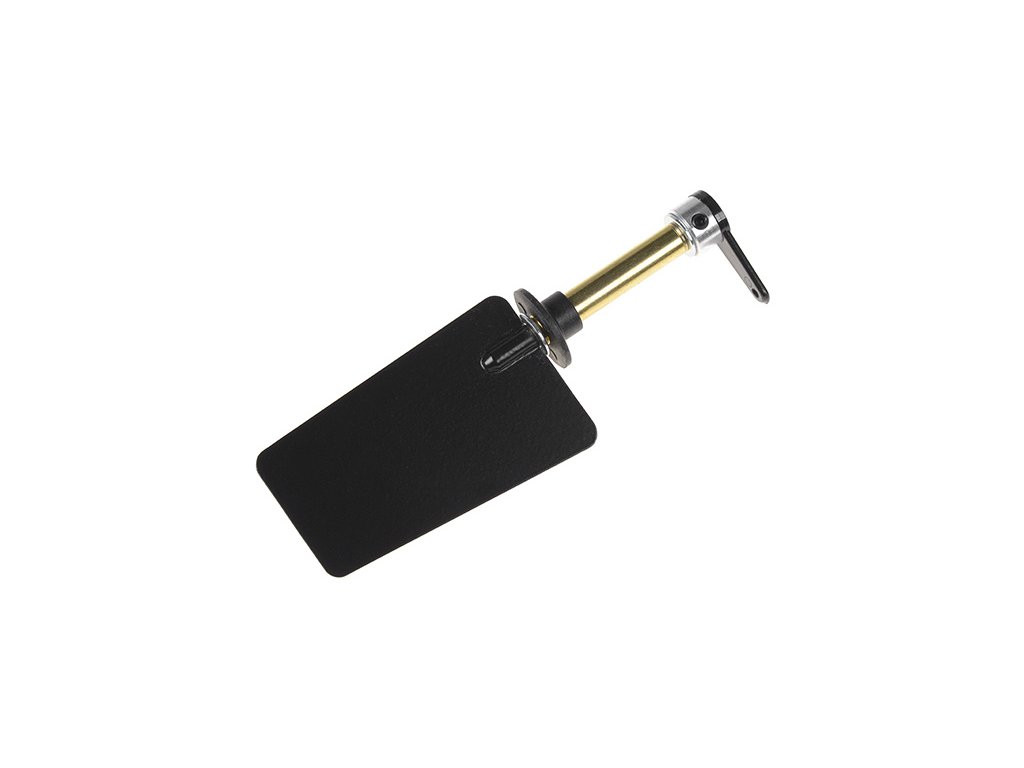 Doporučené příslušenství pro RC modely lodí, Lodní kormidlo kovové lichoběžníkové 52x32mm, celková výška 92mm. Z kormidla jde pevná mosazná hřídel 4mm o délce 40mm, na které je červíkem polohována plastová páka s hliníkovým pouzdrem s osou otvoru ve vzdálenosti 16mm od osy otáčení. Na otočné trubce 6/4mm je pouzdro s průměry 8/16mm.