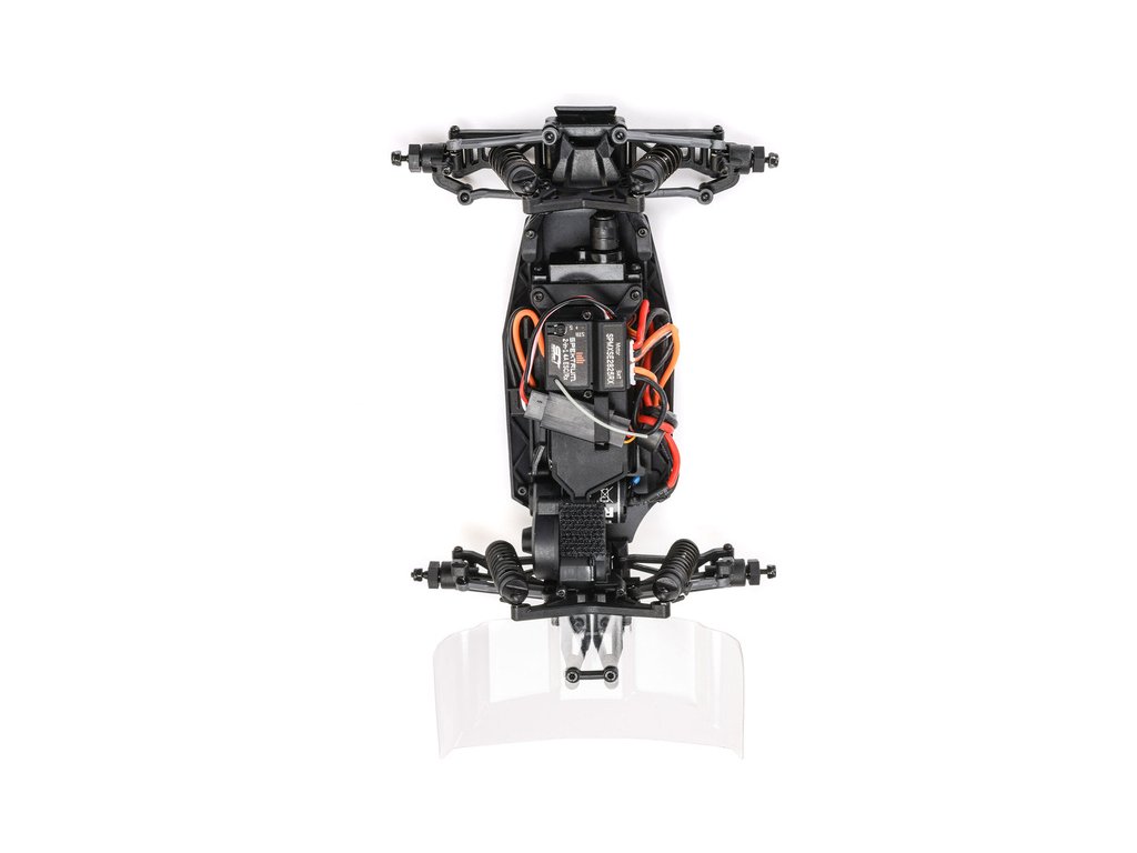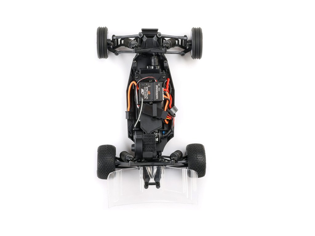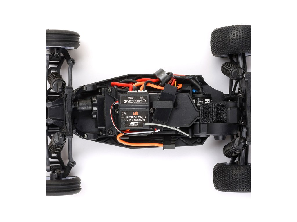 Díky svému designu inspirovanému TLR, posouvá Losi Micro-B na další úroveň výkonu. Konstrukce je inspirována modelem, který vyhrál v roce 2023 mistrovství světa IFMAR. Model obsahuje nastavitelné a laditelné tlumiče plněné olejem, které zlepšují ovladatelnost a absorbují nerovnosti a skoky. Černě eloxované hliníkové šasi je pevné a tuhé. 350mAh LiPol baterie prodlužuje dobu provozu na téměř 20 minut. Když pak přijde čas na nabíjení, snadno použitelná nabíječka USB-C to zvládne za méně než hodinu. Maximální rychlost až 20 km/hod se může zdát naprosto šílená na model této velikosti. Pokud si však nejste jisti, zda jste připraveni to zvládnout, přiložený vysílač Spektrum SLT2 má přepínač pro omezení rychlosti na 50 % nebo 75 %. Tato funkce omezení plynu je ideální pro mladé nebo nezkušené řidiče.