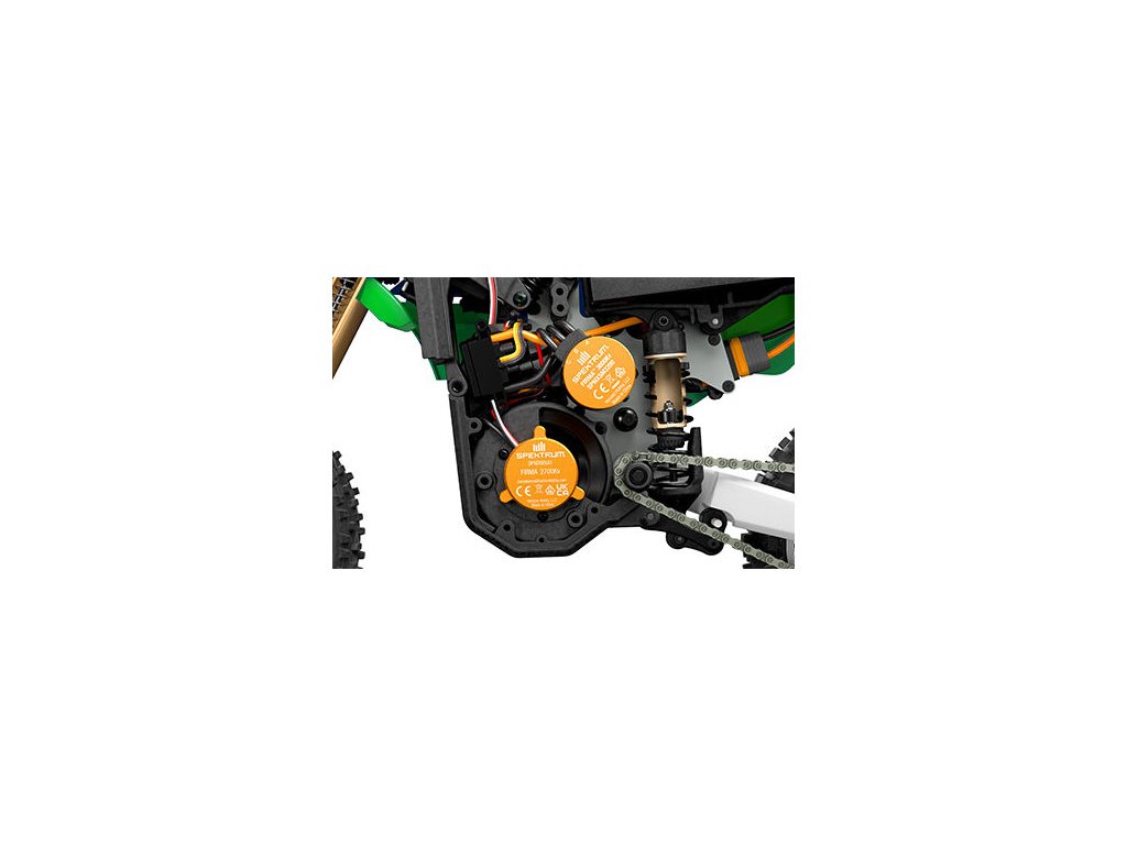 Aby bylo možné vytvořit správný maketový vzhled štíhlé terénní motorky, musela se elektronika a baterie vejít do kompaktního úzkého podvozku. I přes stísněné prostory v šasi, lze umístit do krabičky pro baterii v sedle jezdce standardní akumulátor 2S LiPol 5000 mAh. Je potřeba použít LiPol baterii s konektorem IC5 nebo EC5.