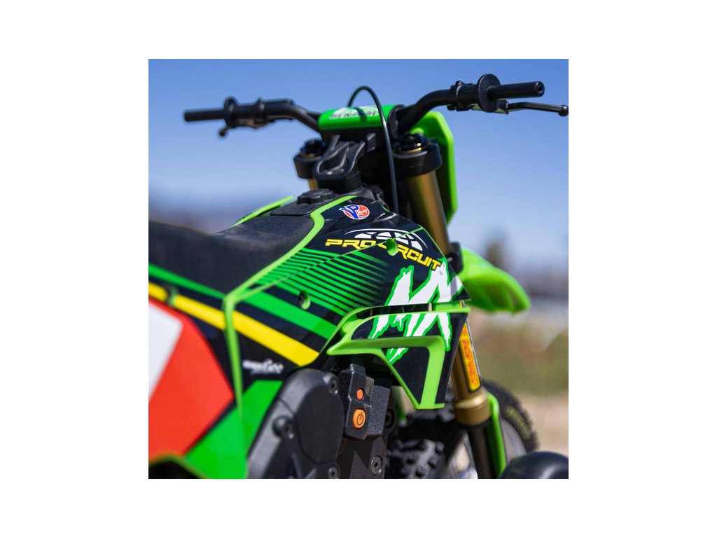 Žádný motokrosový stroj by nevypadal dobře bez pořádné grafiky. Promoto-MX má veškeré díly – přední blatník, poznávací značku, chrániče vidlice, přední a zadní boční panel i zadní blatník – vše je zbarveno v oficiálně licencované vinylové grafice, která je ale vysoce odolná a připravená k závodům.