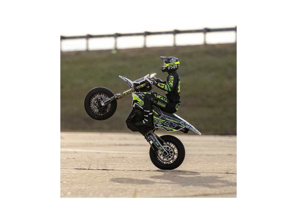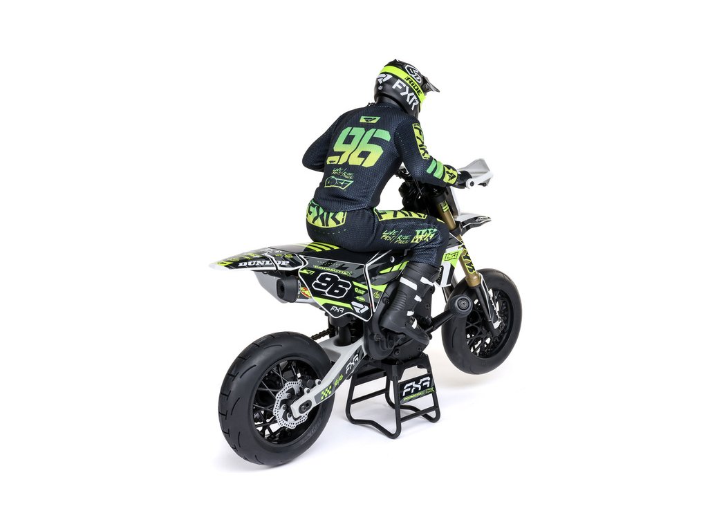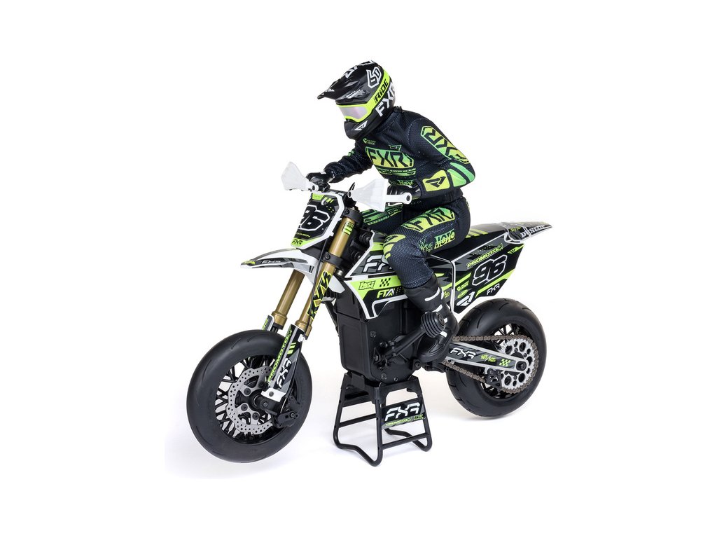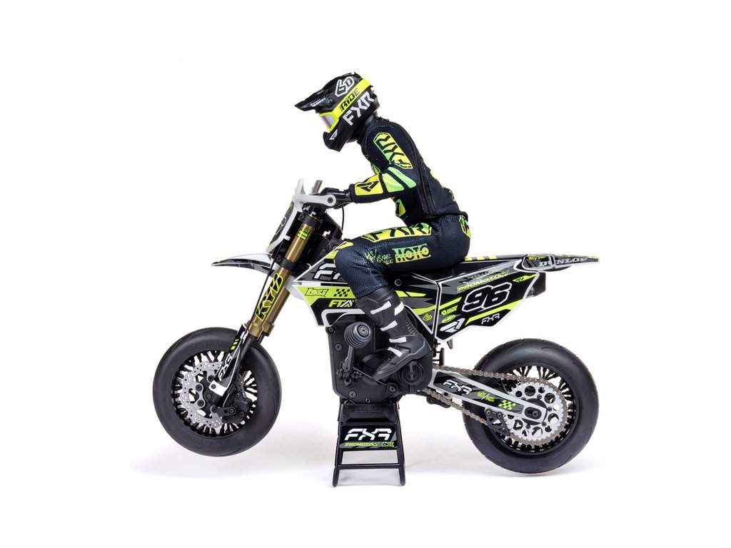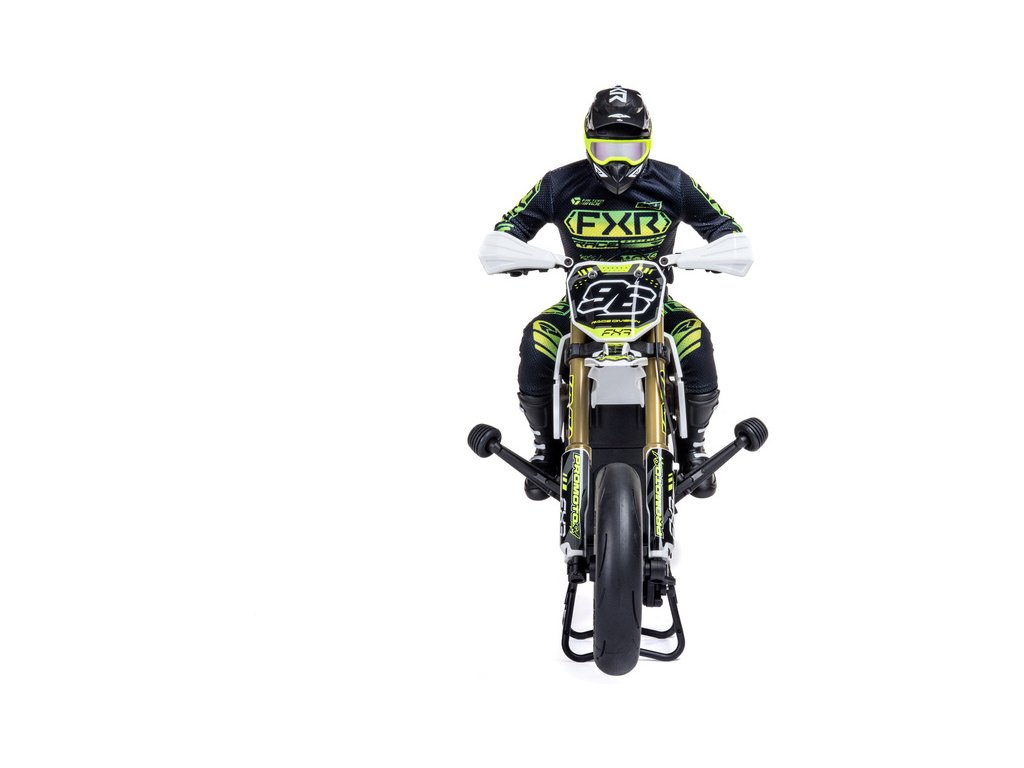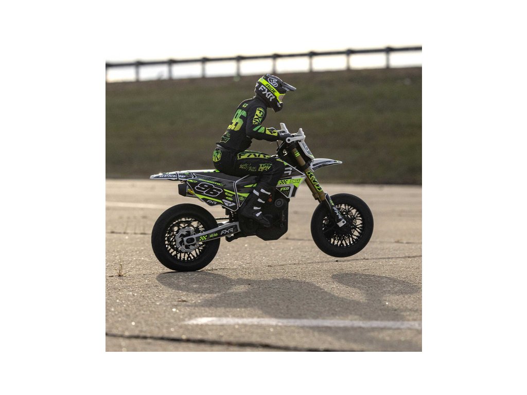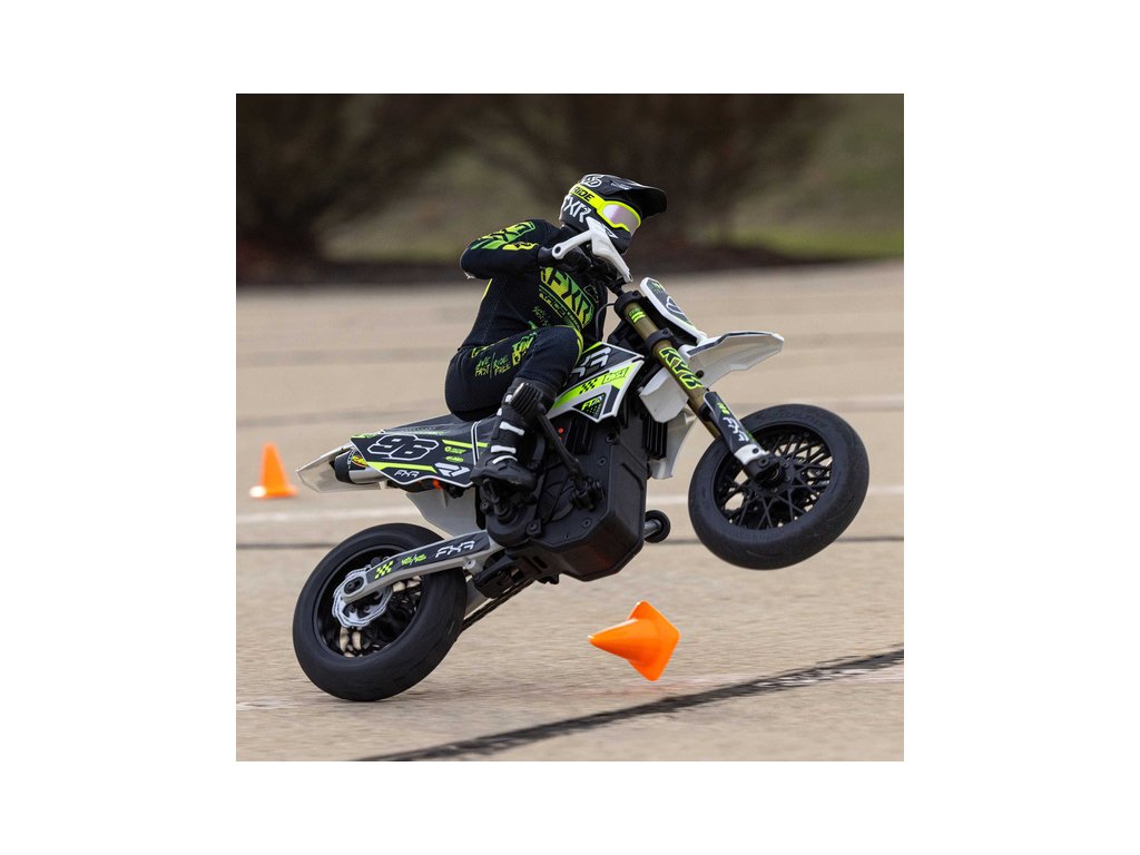Motorka na dálkové ovládání Promoto-SM vypadá jako skutečný motard. Mezi výrazné maketové detaily patří chrániče rukou, zkrácený přední blatník a oficiálně licencovaná grafika FXR s oblečením jezdce. Maketový vzhled se skloubí s technicky výborně zvládnutým realistickým ovládáním motorky a s vysokým výkonem střídavého motoru. To vše díky jedinečnému spojení mechanické a elektronické technologie, vyvinuté speciálně pro Losi Promoto.