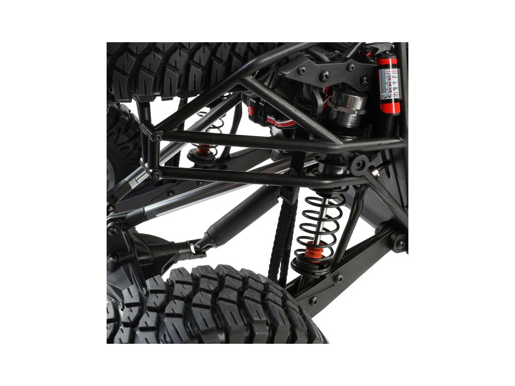 Vývojový tým Losi vyrobil novou konstrukci podvozku. Deska šasi z eloxovaného 4 mm hliníku 6061-T6 je základem, na který je připevněna realistická klec ze super pevného kompozitního materiálu. Nezávislé zavěšení přední nápravy a 4-bodové zavěšení zadní nápravy, je přesně podle vzoru velkých závodních aut. Utěsněná převodovka a diferenciál pomáhají zvládnout vysoký výkon pohonné jednotky, stejně jako k bezpečné jízdě olejové tlumiče s dlouhým zdvihem. Praktický kryt baterie ve spodní části podvozku umožňuje snadnou výměnu baterie, aniž by bylo nutné demontovat karosérii. Ke vzhledu auta přispívají maketové tlumiče, hasící přístroj, zpětné zrcátka, kabina s jezdci i atraktivní zbarvení karosérie.