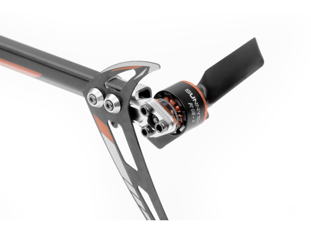 Podívejme se blíže na tenhle nejnovější skvost z konstrukčních kanceláří OMP Hobby. Základ konstrukce trupu tvoří duralové motorové lože a pouzdro hlavní hřídele s připojenými uhlíkovými bočnicemi a příčkami, plastovým lyžinovým podvozkem a ocasním nosníkem z profilované duralové trubky s uhlíkovým svislým stabilizátorem. V rámu je uložen střídavý elektromotor Sunnysky® R23-2 s rotačním pláštěm pohánějící přímo, bez obvyklých převodů, nosný rotor. Stejně tak vyrovnávací rotor pohání přímo miniaturní střídavý motor Sunnysky® R08-2. Díky tomu je celá mechanika maximálně zjednodušena, odpadají potíže s drhnoucími smykátky, očesanými převody nebo prokluzujícími náhony.