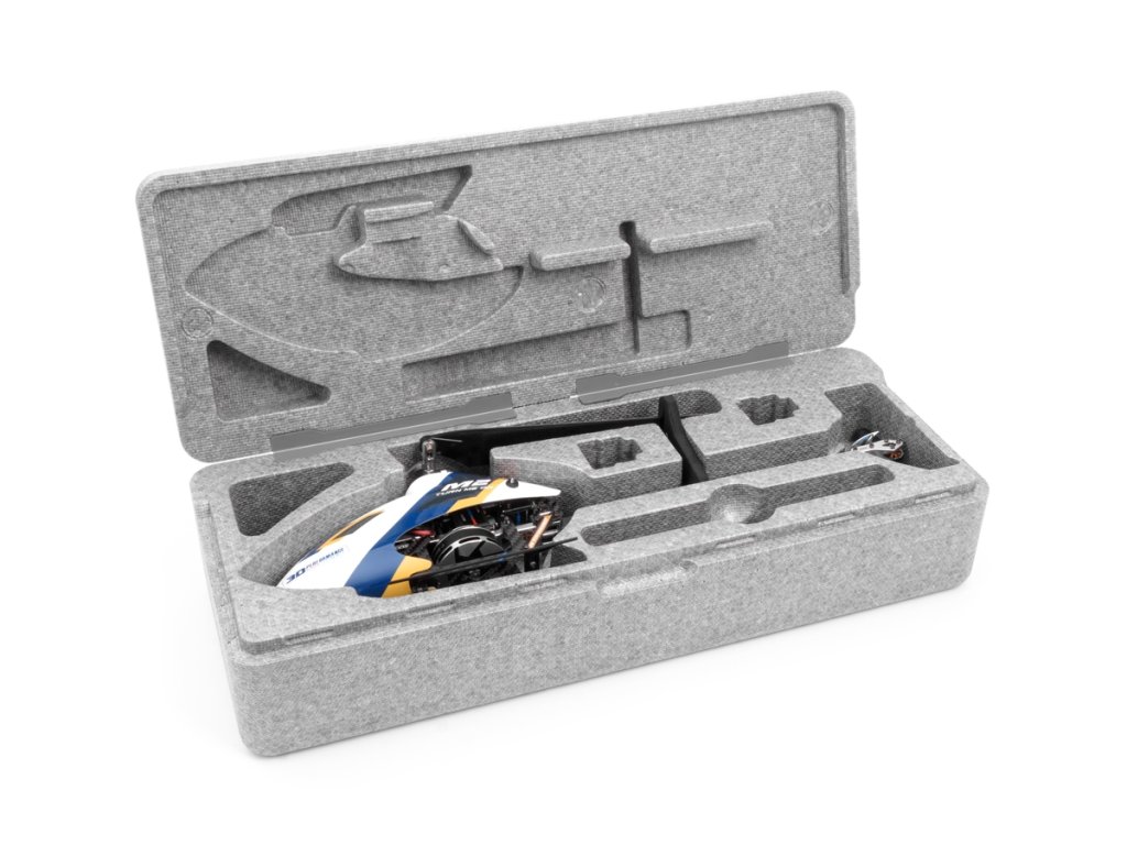 ARF set vrtulníku obsahuje: 100% sestavený a k letu připravený model M2 EVO, pohonný akumulátor LiPo 11,1 V 750 mAh 60C, náhradní hlavní hřídel a hřídel nosného rotoru, náhradní páky serv a malá sada šroubů, přípravek pro vyrovnávání desky cykliky, pevnou krabici z pěnového EPP s odklopným víkem pro bezpečné přepravování a skladování modelu, návod k obsluze modelu a nastavování řídící jednotky.