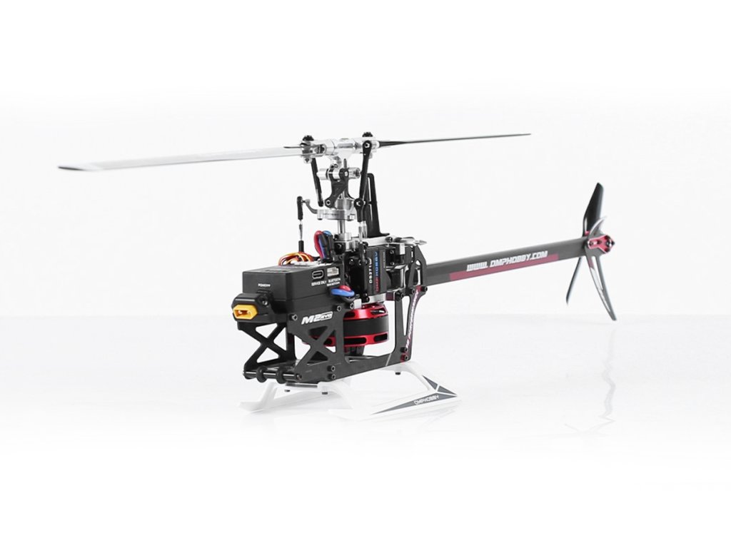 Elektroniku vrtulníku tvoří inteligentní řídící jednotka s novou 3G flybarless řídící jednotkou OFS3 s integrovaným elektronickým regulátorem otáček s funkcí governoru pro motor nosného rotoru a regulátorem pro motor vyrovnávacího rotoru; a tři 10g digitální serva (1,65 kg.cm, 0,08 s/60°) ovládající CCPM (120°) mixovanou desku cykliky. Pro řízení vrtulníku budete potřebovat aspoň šestikanálovou RC soupravu s miniaturním přijímačem s S.BUS portem (nebo také DSM2/DSMX a nově rovněž s obousměrným CRSF protokolem s telemetrií - podporovány jsou systémy TBS Crossfire, Tracer a ExpressLRS). Pro obyčejné poletování nemusí být vysílač ani počítačový (všechny potřebné mixy obstarává řídící jednotka), stačí jen 4 kanály „na kniplech“ a pátý kanál s dvoupolohovým přepínačem pro přepínání režimů řídící jednotky se stabilizací a 3D. Samozřejmě, pro plnohodnotné klasické a 3D létání je třeba počítačový vysílač s nastavitelnými 2-3 letovými režimy s aspoň pětibodovými křivkami kolektivu pro visení a akrobacii a dalším režimem pro autorotaci. Díky rozsáhlým možnostem nastavování řídící jednotky v mobilní aplikaci (včetně detailního nastavování PIDF regulačních smyček) je možné většinu nastavení, které dříve vyžadovaly pokročilou počítačovou RC soupravu, provést na vašem mobilu v aplikaci (pro operační systémy iOS i Android). Můžete, ale nemusíte - řídící jednotka je dodávána přednastavená; její základní parametry je v případě potřeby možné dolaďovat také pomocí programovacího tlačítka a indikačních LED na řídící jednotce, jako tomu bylo u starších verzí řídících jednotek OMPHOBBY.