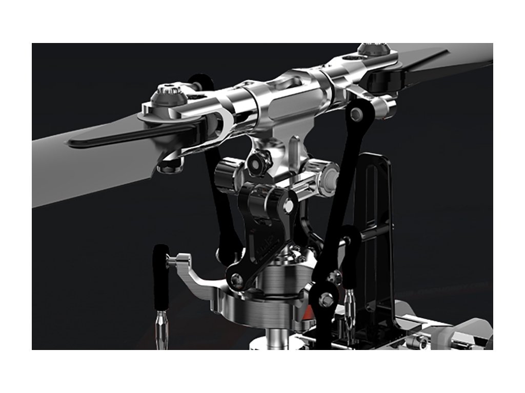 Robustní 4 mm hlavní hřídel je uložena v kuličkových ložiscích. Deska cykliky je duralová stejně jako rotorová hlava s unašeči listů. Díky 3G flybarless systému a elektronickému CCPM je rotorová hlava s optimalizovanou geometrií velmi jednoduchá. Unašeče listů nosného rotoru jsou nádhernou miniaturou unašečů „velkých" RC vrtulníků - se všemi těmi kuličkovými ložisky a tlumícími vložkami!
