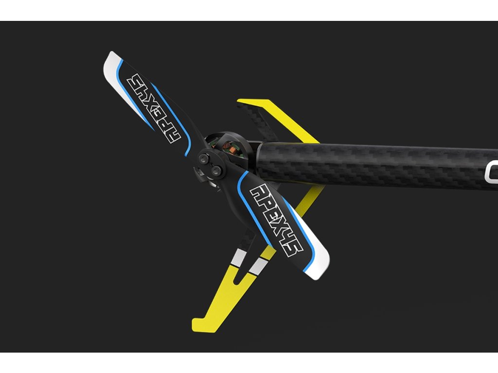 Robustní 4 mm hlavní hřídel je uložena v kuličkových ložiscích. Deska cykliky je duralová stejně jako rotorová hlava s unašeči listů. Díky 3G flybarless systému a elektronickému CCPM je rotorová hlava s nově optimalizovanou geometrií a zvětšeným rozsahem výchylek cyklického a kolektivního řízení velmi jednoduchá. Unašeče listů nosného rotoru jsou nádhernou miniaturou unašečů „velkých" RC vrtulníků - se všemi těmi kuličkovými ložisky a tlumícími vložkami! Nové rotorové listy APEX 190 nabízejí vyšší účinnost a nižší hlučnost; přitom mají dostatečnou tuhost na zvládnutí většího rozsahu výchylek řízení.