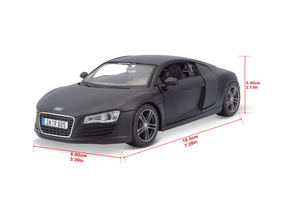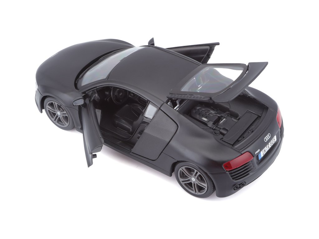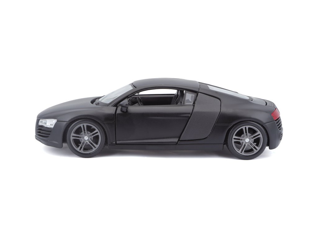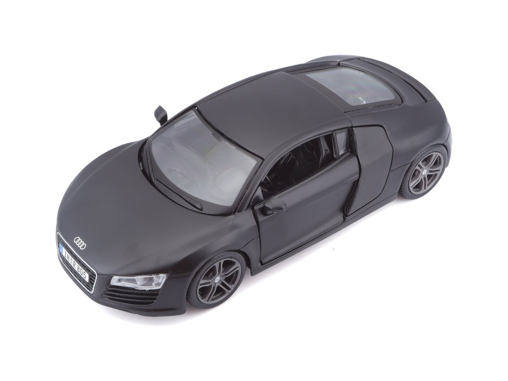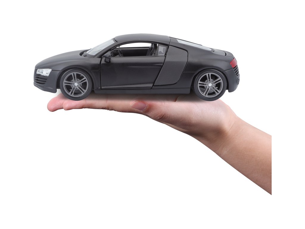 Kovový model auta 1:24 Maisto 31281 Audi R8 nejen pro sběratele. Model je v detailním provedení a má otevíratelné dveře. Barva modelu je černá matná a je přibližně 17 cm velký.