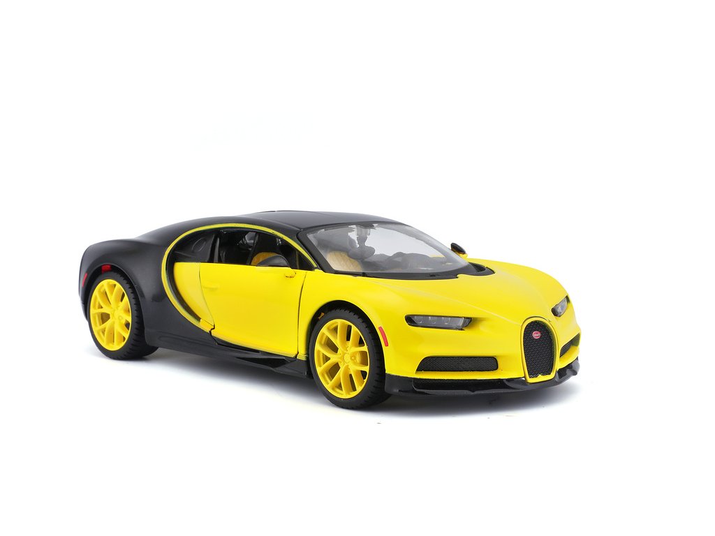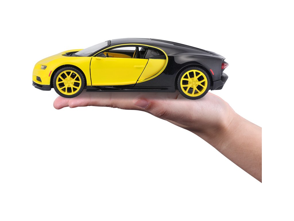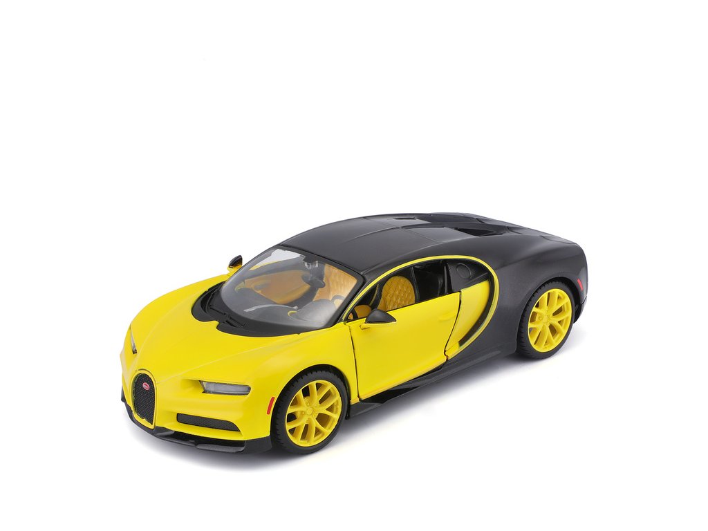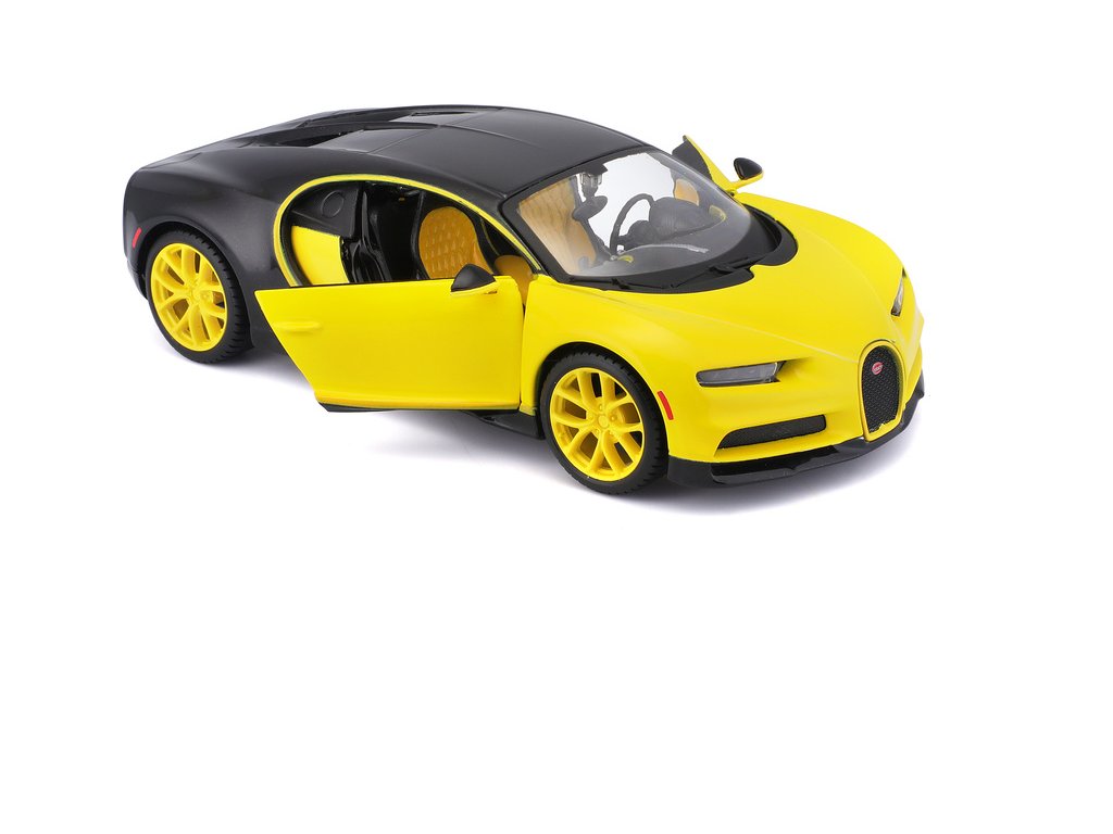 Kovový model auta 1:24 Maisto 31514 Bugatti Chiron nejen pro sběratele. Model je v detailním provedení a má otevíratelné dveře. Barva modelu je žluto-černá a je přibližně 19 cm velký.