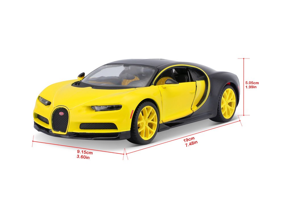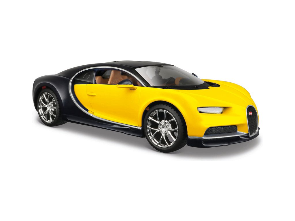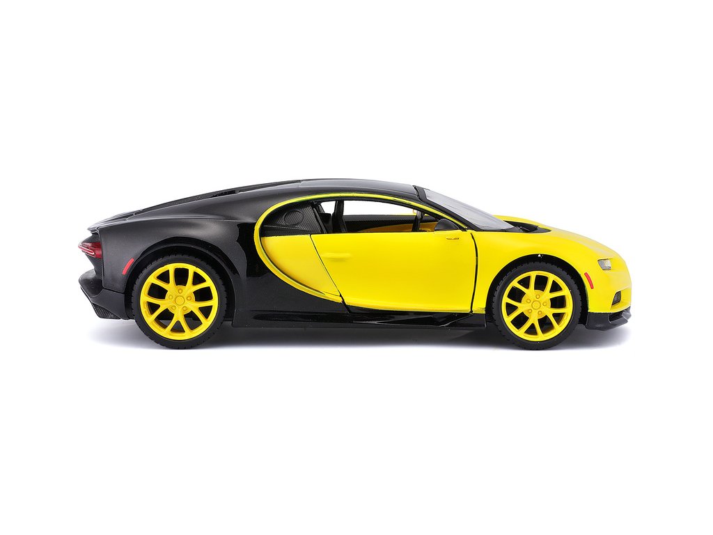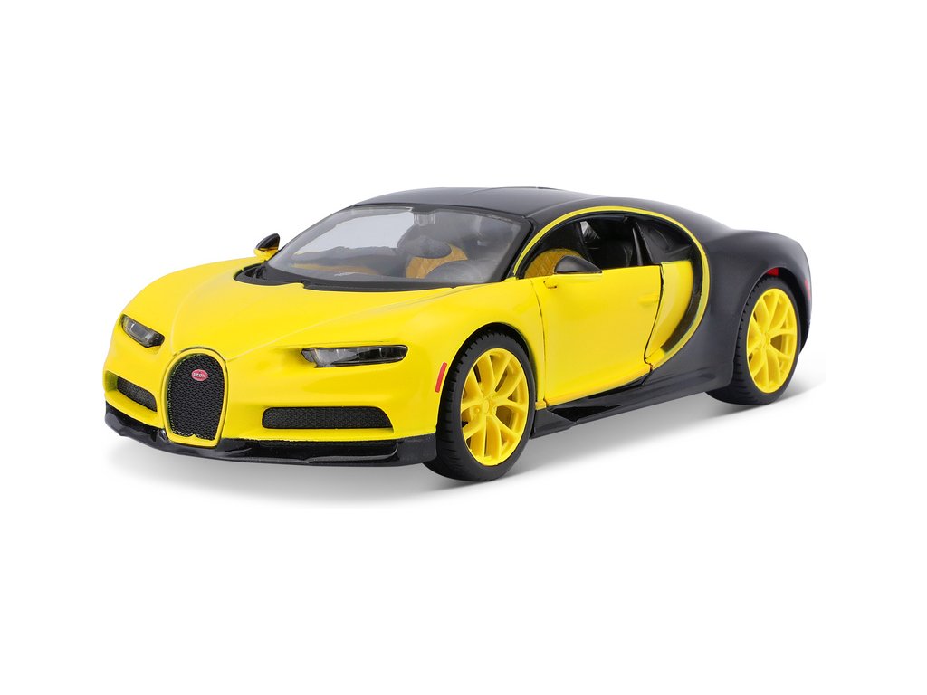 Kovový model auta 1:24 Maisto 31514 Bugatti Chiron nejen pro sběratele. Model je v detailním provedení a má otevíratelné dveře. Barva modelu je žluto-černá a je přibližně 19 cm velký.