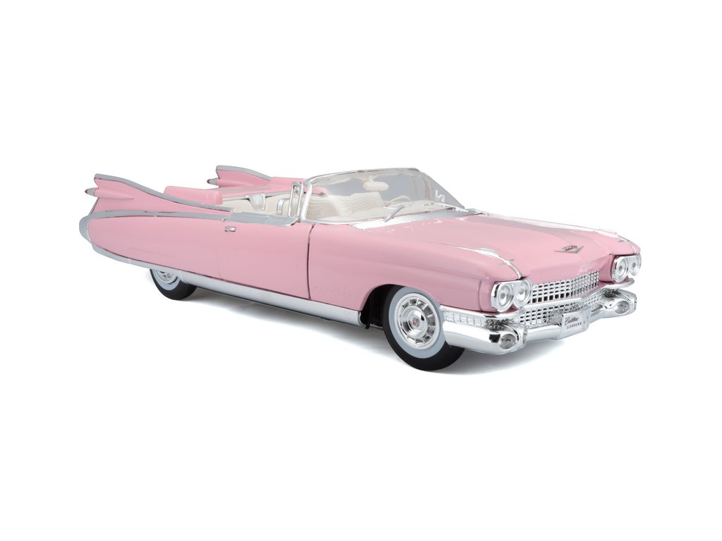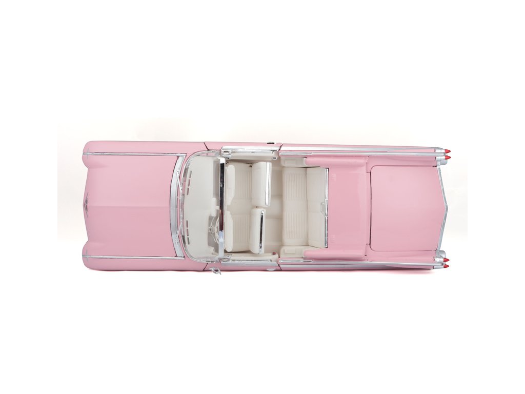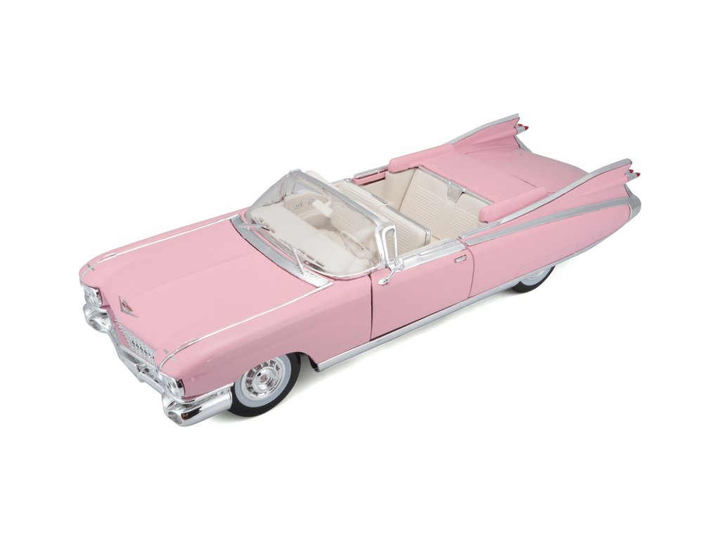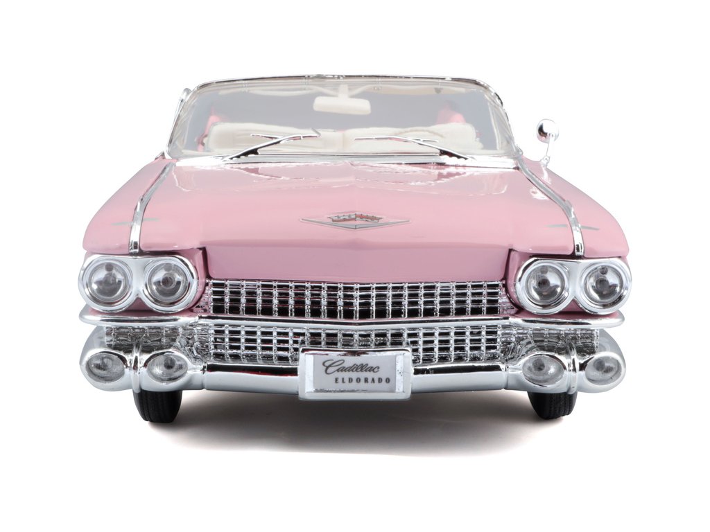Kovový model auta 1:18 Maisto 36813 Cadillac Eldorado Biarritz 1959 nejen pro sběratele. Model je v detailním provedení na plastovém podstavci. Barva modelu je růžová a je přibližně 27 cm velký.