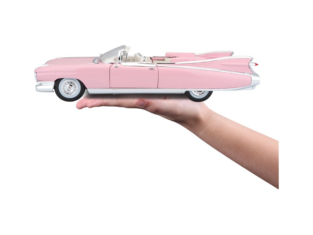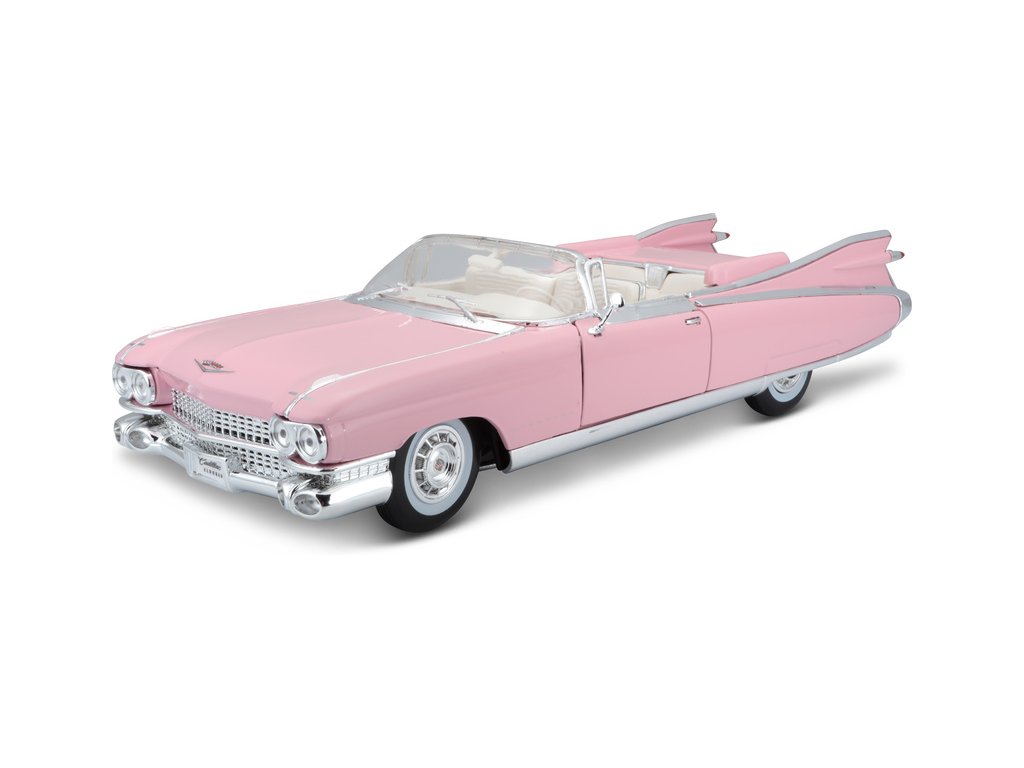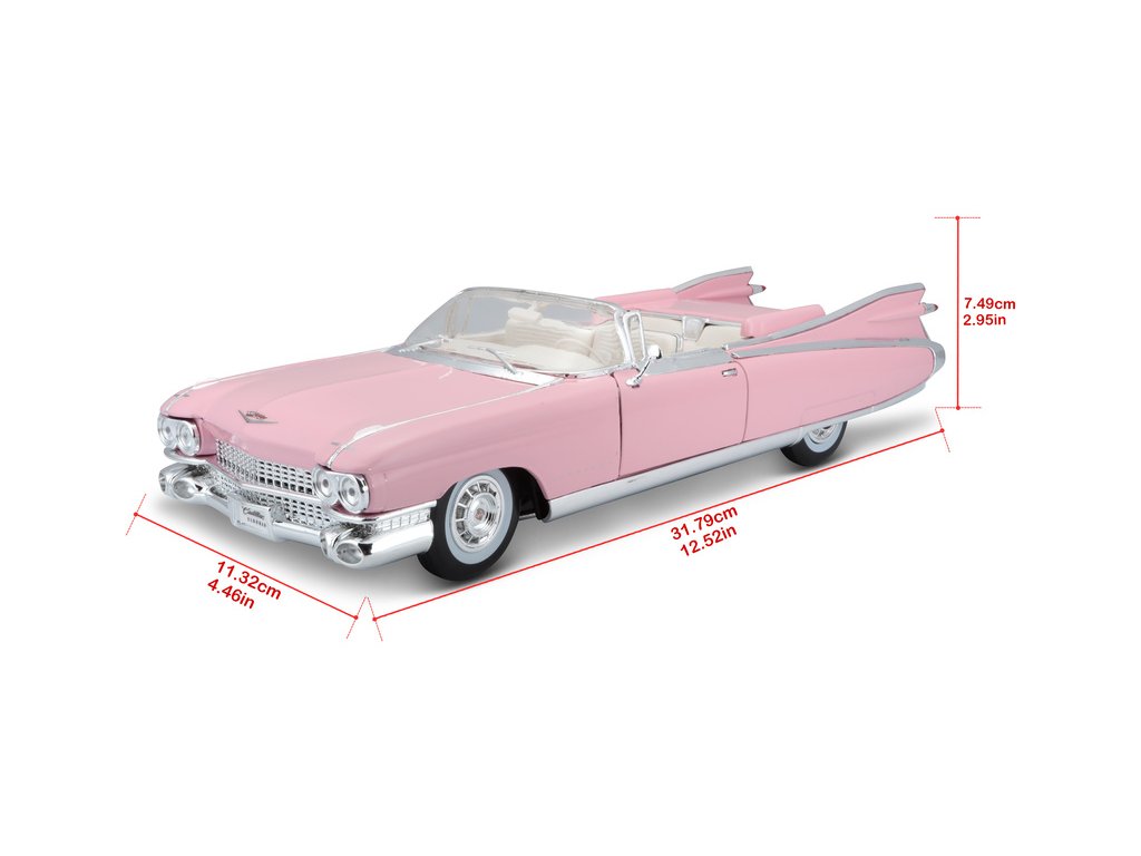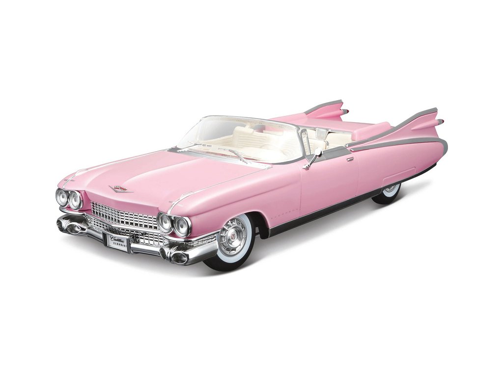 Kovový model auta 1:18 Maisto 36813 Cadillac Eldorado Biarritz 1959 nejen pro sběratele. Model je v detailním provedení na plastovém podstavci. Barva modelu je růžová a je přibližně 27 cm velký.