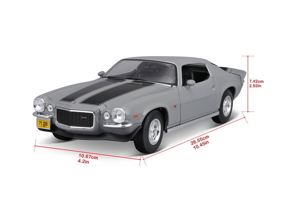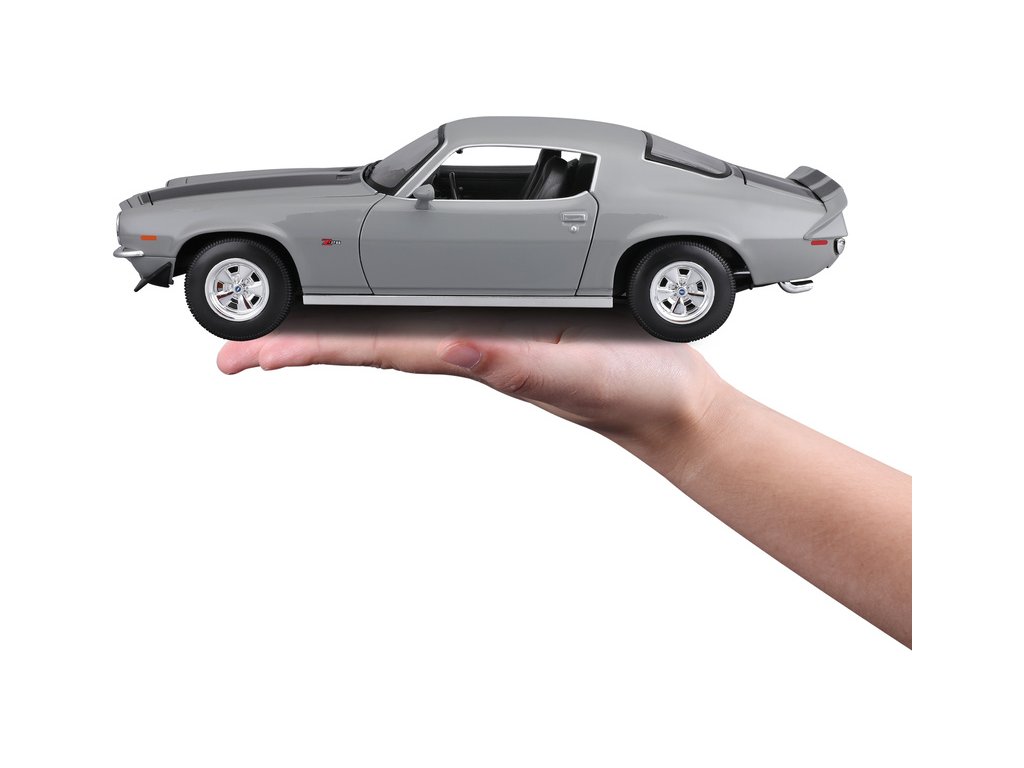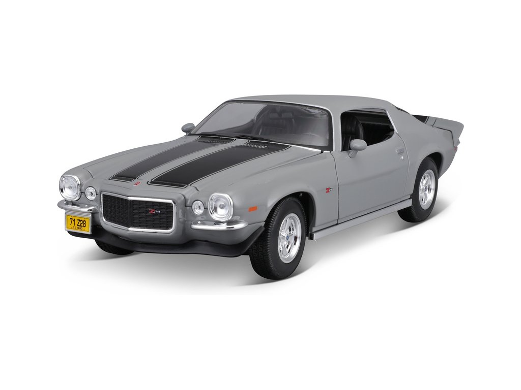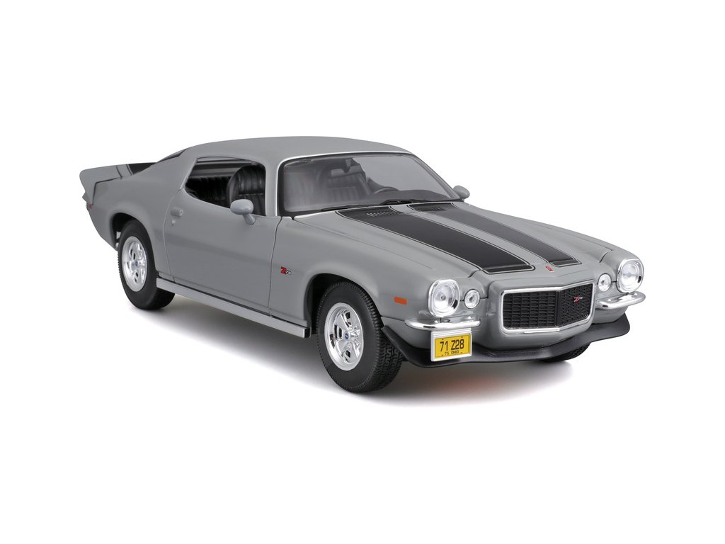 Kovový model auta 1:18 Maisto 31131 Chevrolet Camaro 1971 nejen pro sběratele. Model je v detailním provedení na plastovém podstavci. Barva modelu je šedá a je přibližně 27 cm velký.