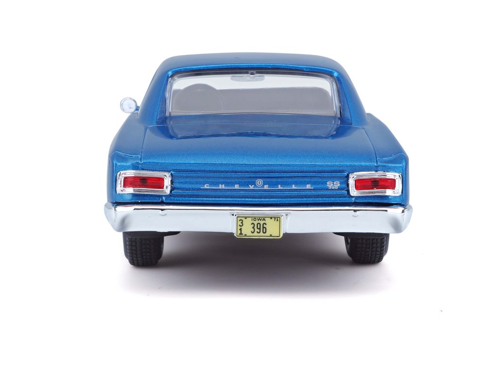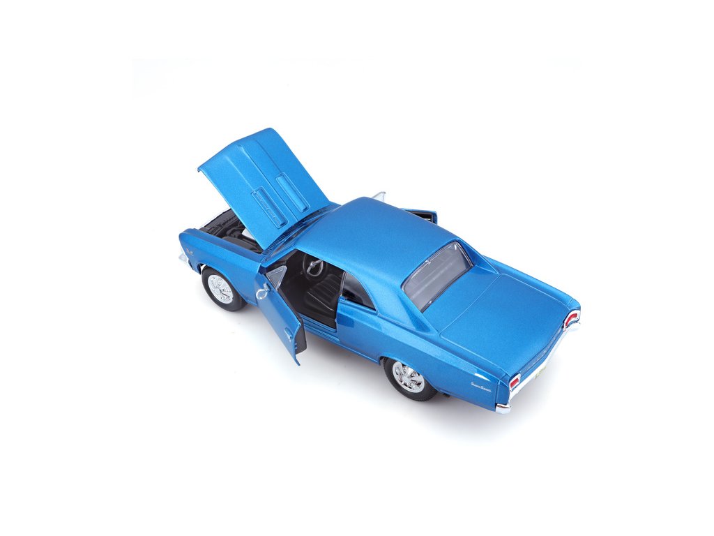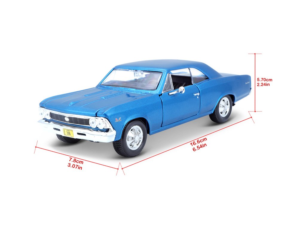 Kovový model auta 1:24 Maisto 31960 Chevrolet Chevelle SS 396 1966 nejen pro sběratele. Model je v detailním provedení a má otevíratelné dveře. Barva modelu je modrá metalíza a je přibližně 17 cm velký.