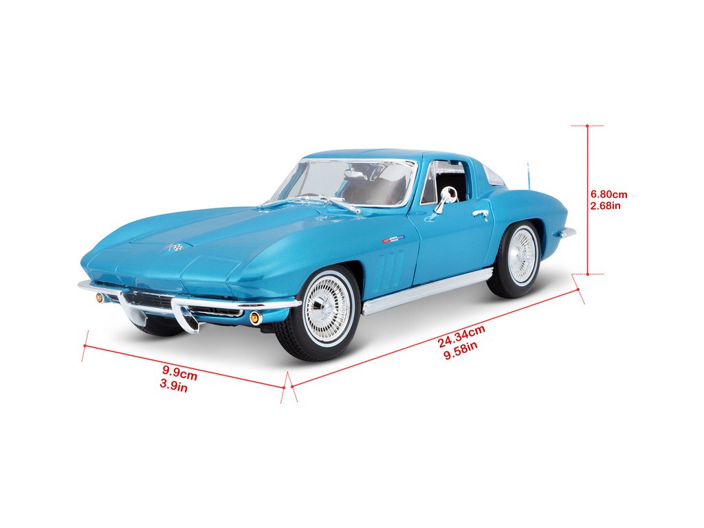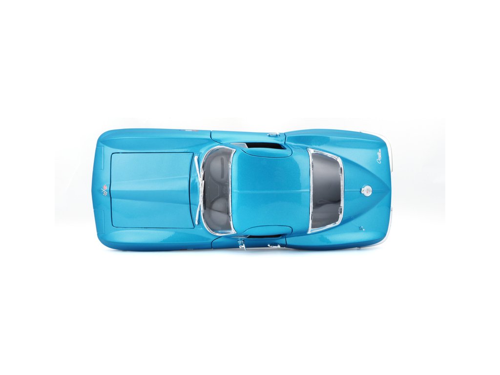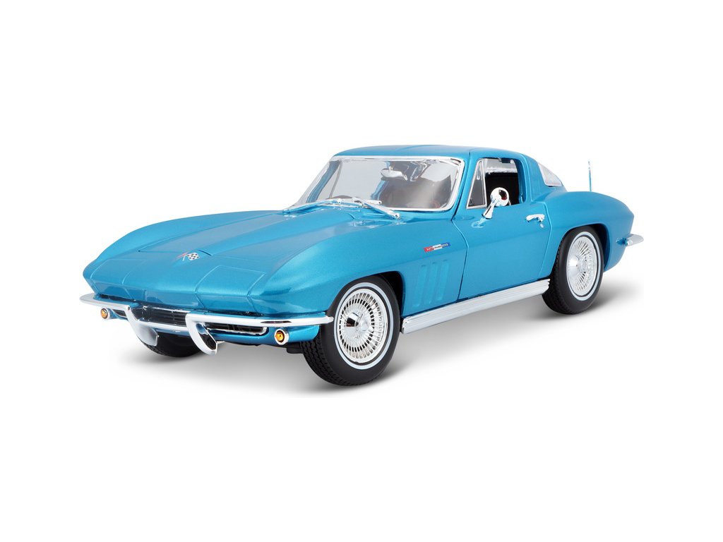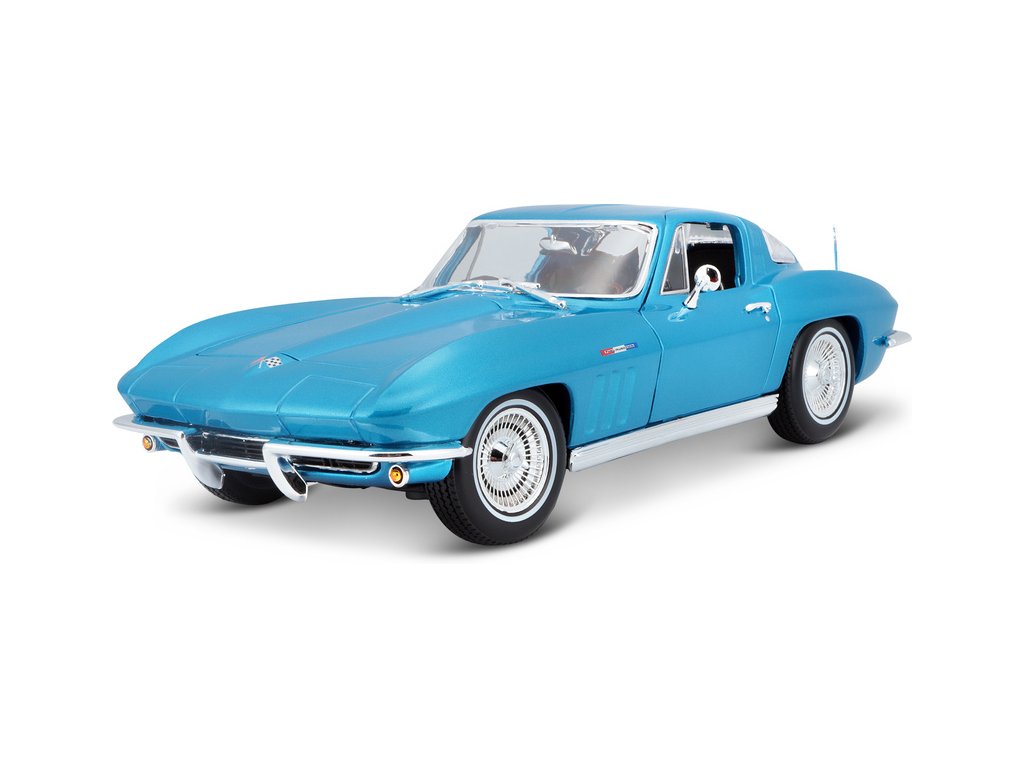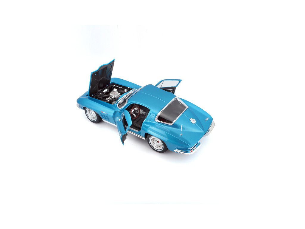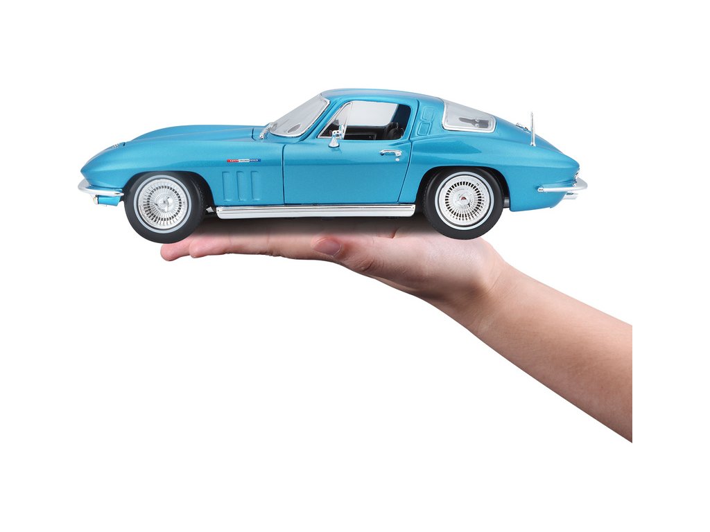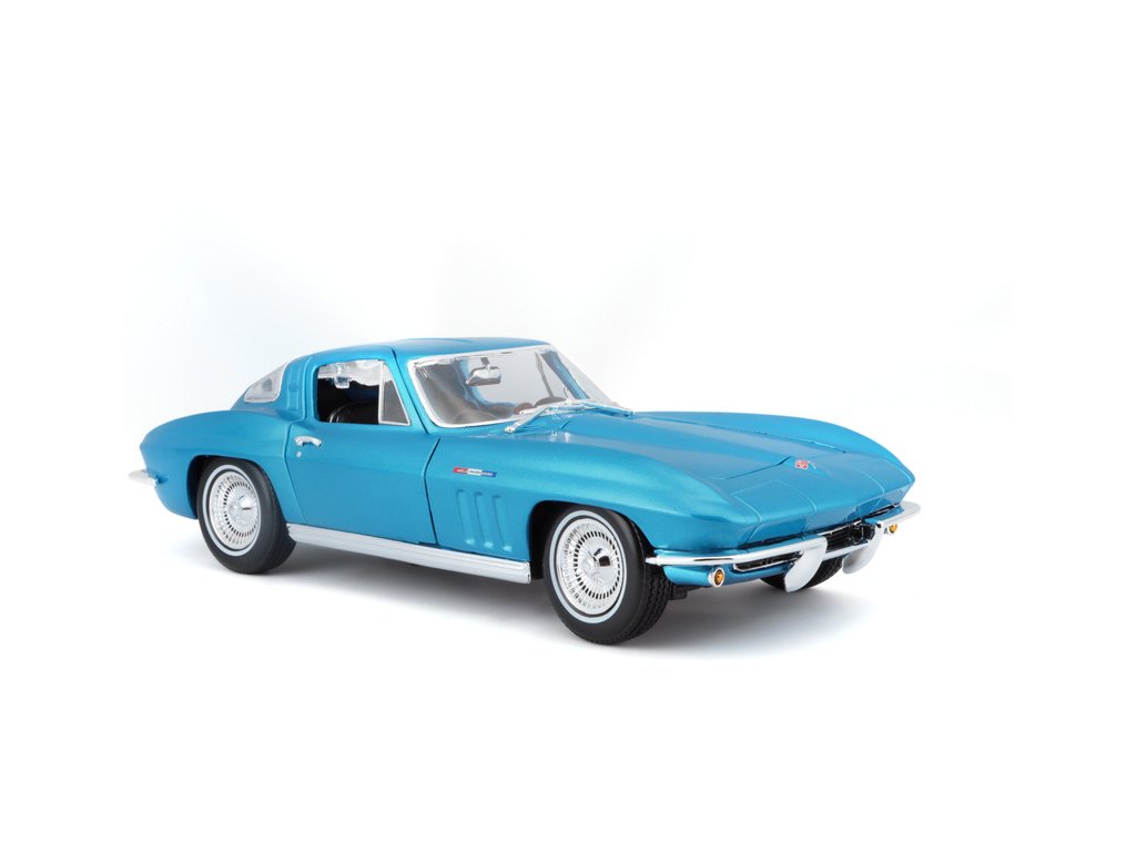 Kovový model auta 1:18 Maisto 31640 Chevrolet Corvette 1965 nejen pro sběratele. Model je v detailním provedení na plastovém podstavci. Barva modelu je světle modrá metalíza.