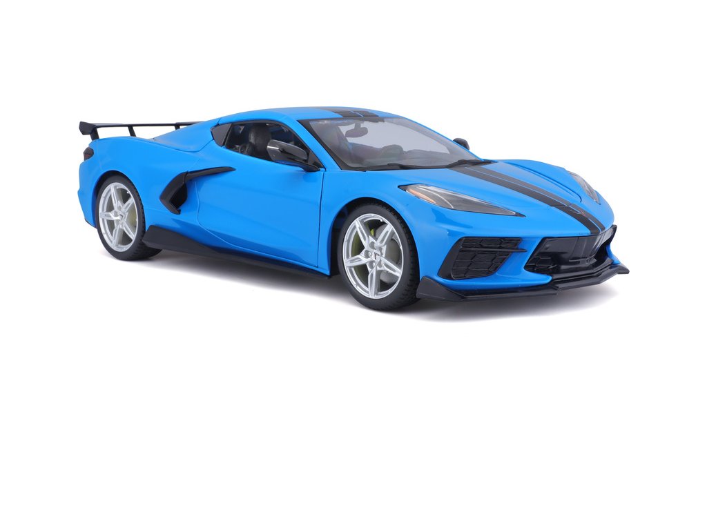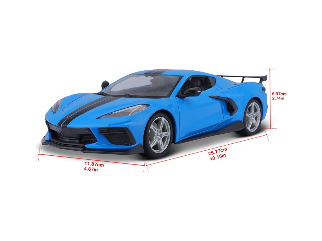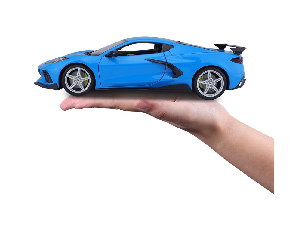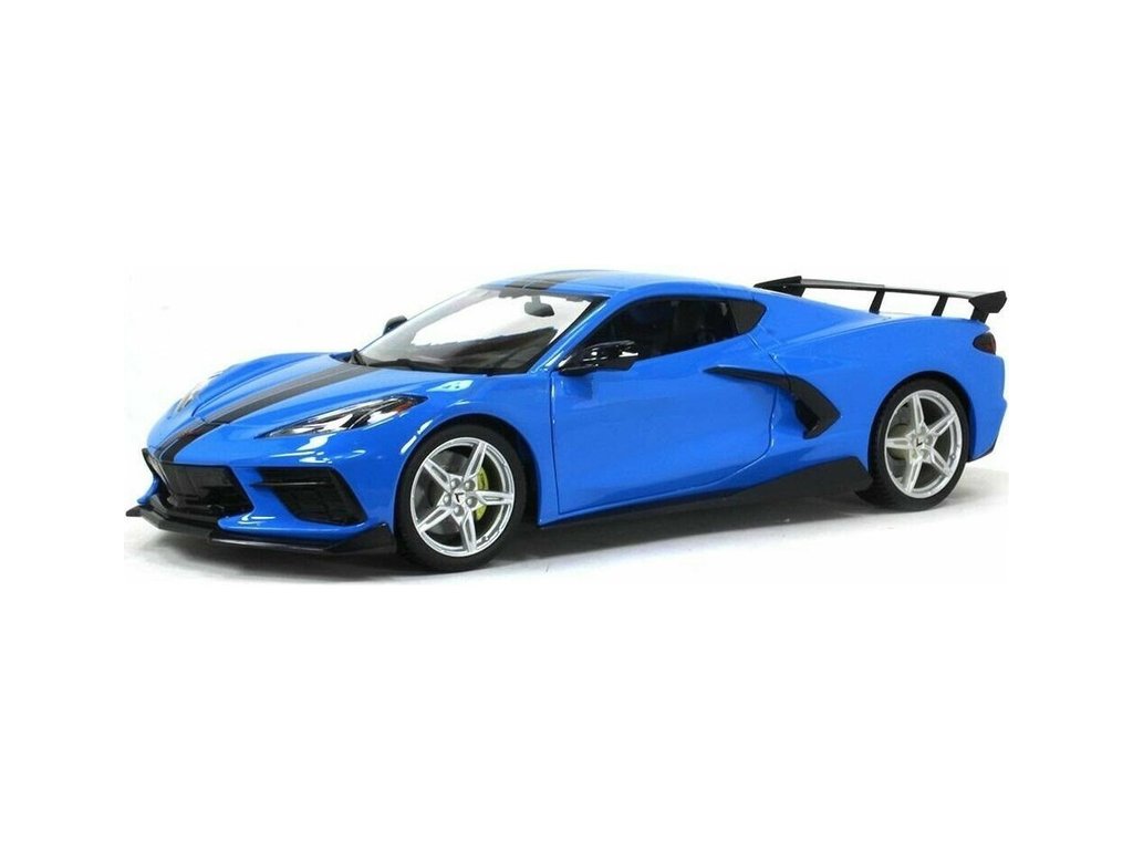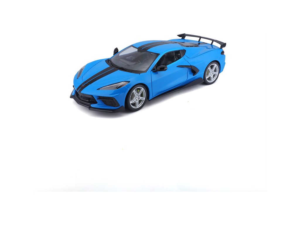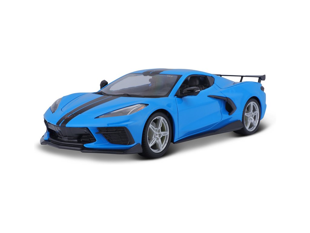 Kovový model auta 1:18 Maisto 31455 Chevrolet Corvette Stingray Coupe 2020 nejen pro sběratele. Model je v detailním provedení na plastovém podstavci. Barva modelu je modrá a je přibližně 27 cm velký.
