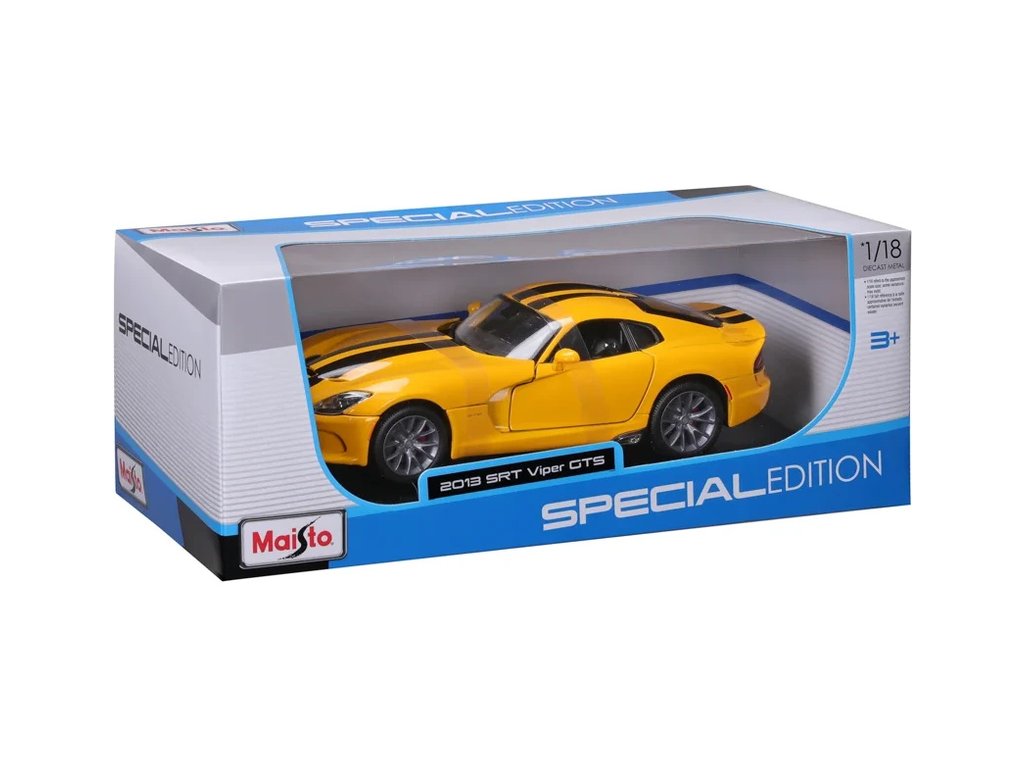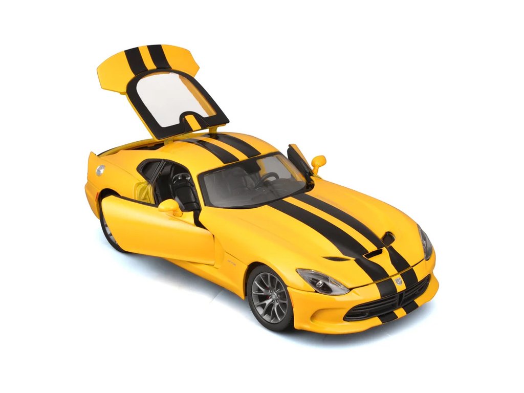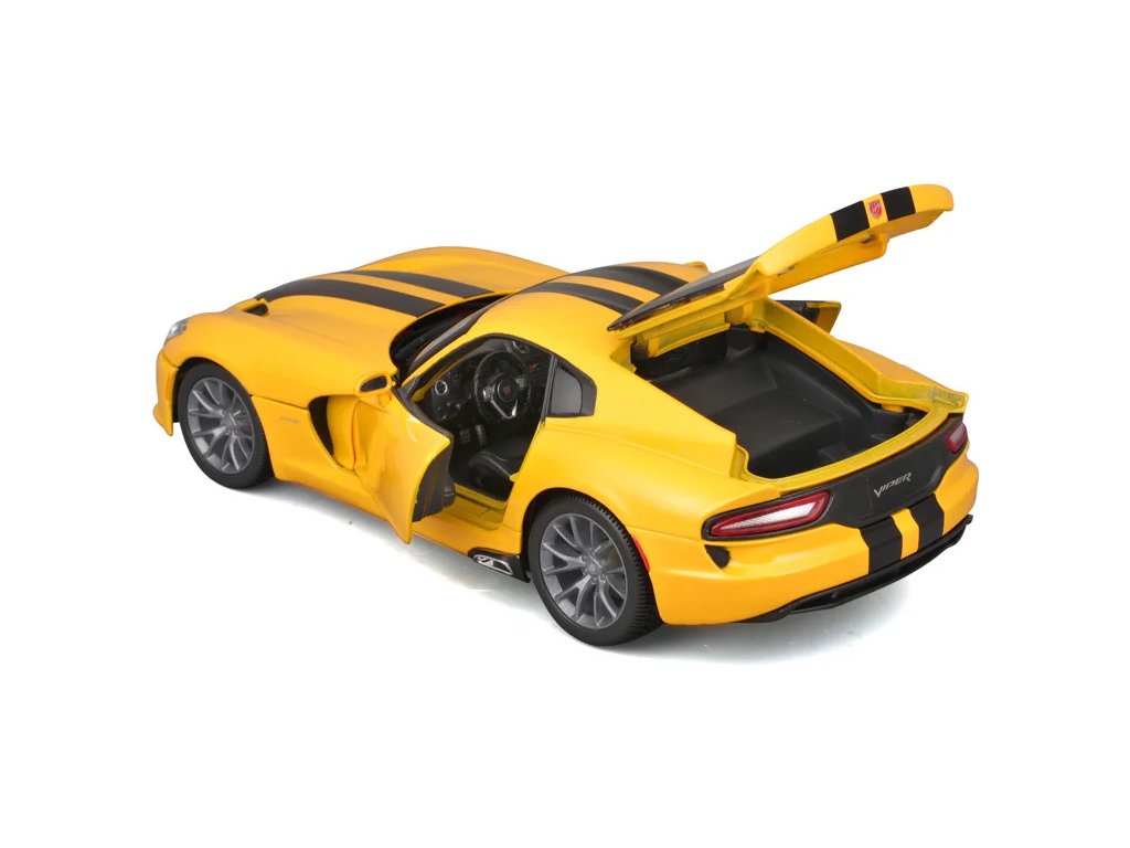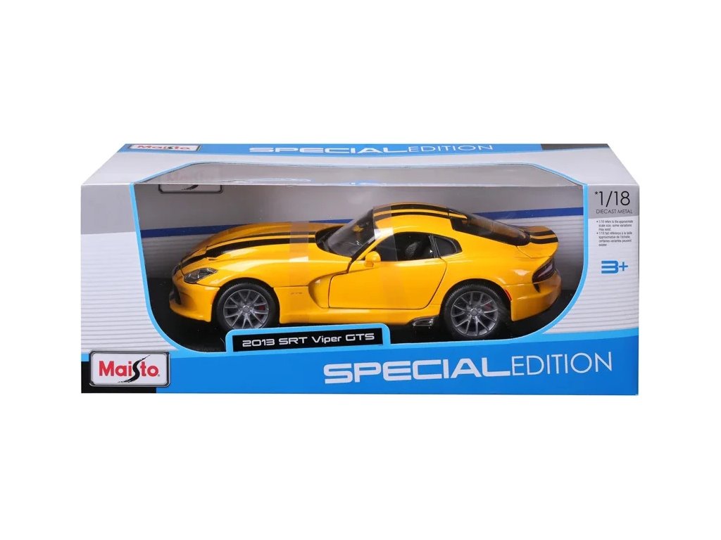 Kovový model auta 1:18 Maisto 31128Y SRT Viper GTS 2013 nejen pro sběratele. Model je v detailním provedení a má otevíratelné dveře. Barva modelu je žlutá a je přibližně 27 cm velký.