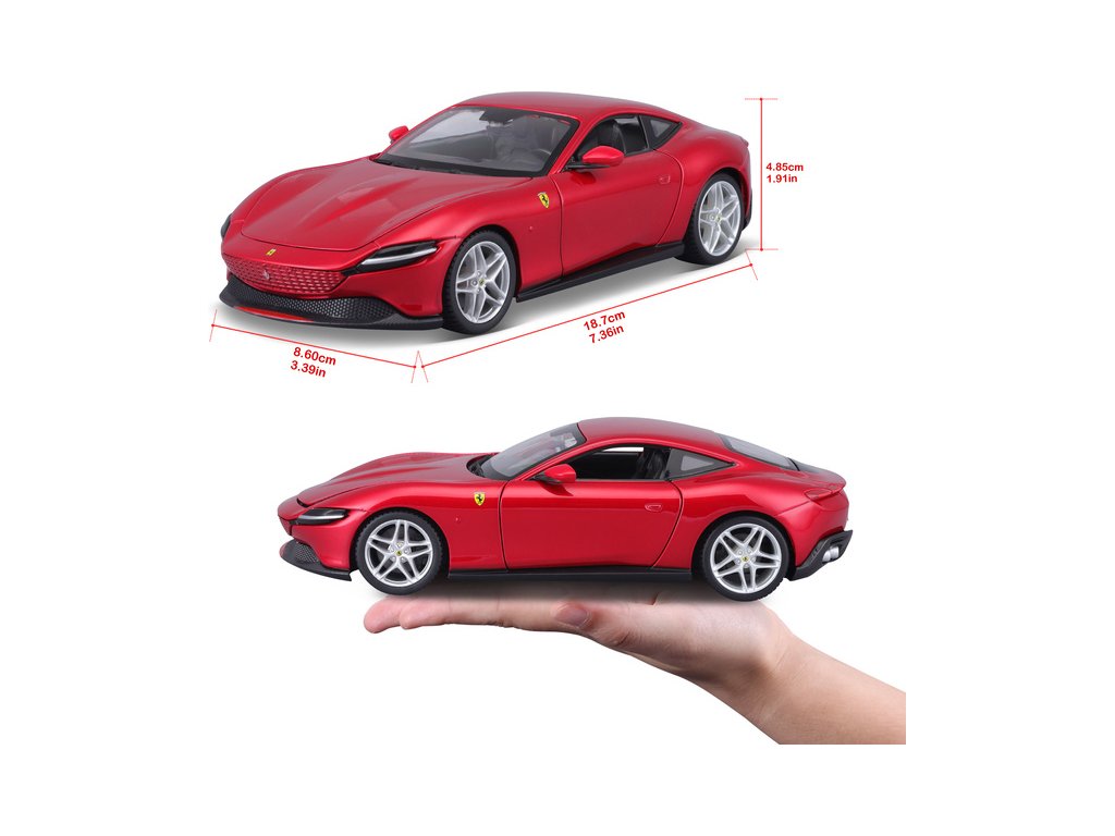 Kovový model auta 1:24 Maisto 39139 Kit Ferrari Roma nejen pro sběratele. Má otevírací dveře a kapotu. Model je ve verzi Kit určené k sestavení. Barva modelu je červená a je přibližně 17 cm velký.