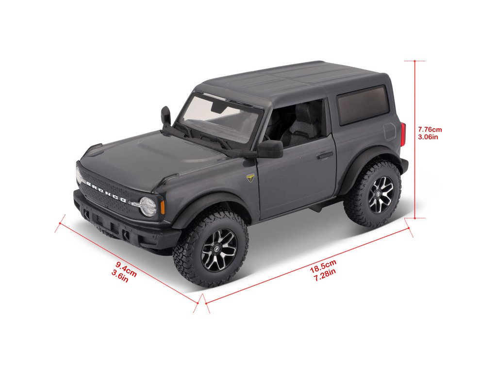 Kovový model Maisto 31530 Ford Bronco 2021 v měřítku 1:24 nejen pro sběratele. Detailní provedení, přívětivá cena, barva tmavě šedá metalíza, délka přibližně 17 cm. Model má otvíratelné dveře.