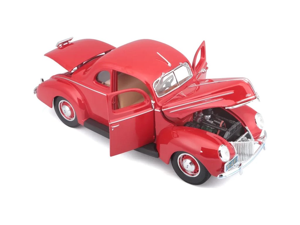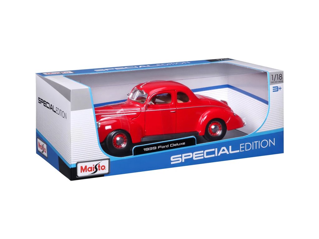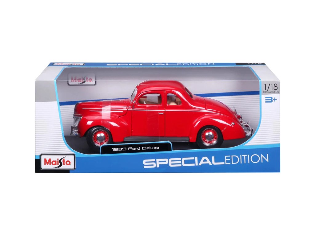 Kovový model auta 1:18 Maisto 31180R Ford Deluxe Coupe 1939 nejen pro sběratele. Model je v detailním provedení a má otevíratelné dveře. Barva modelu je červená a je přibližně 27 cm velký.