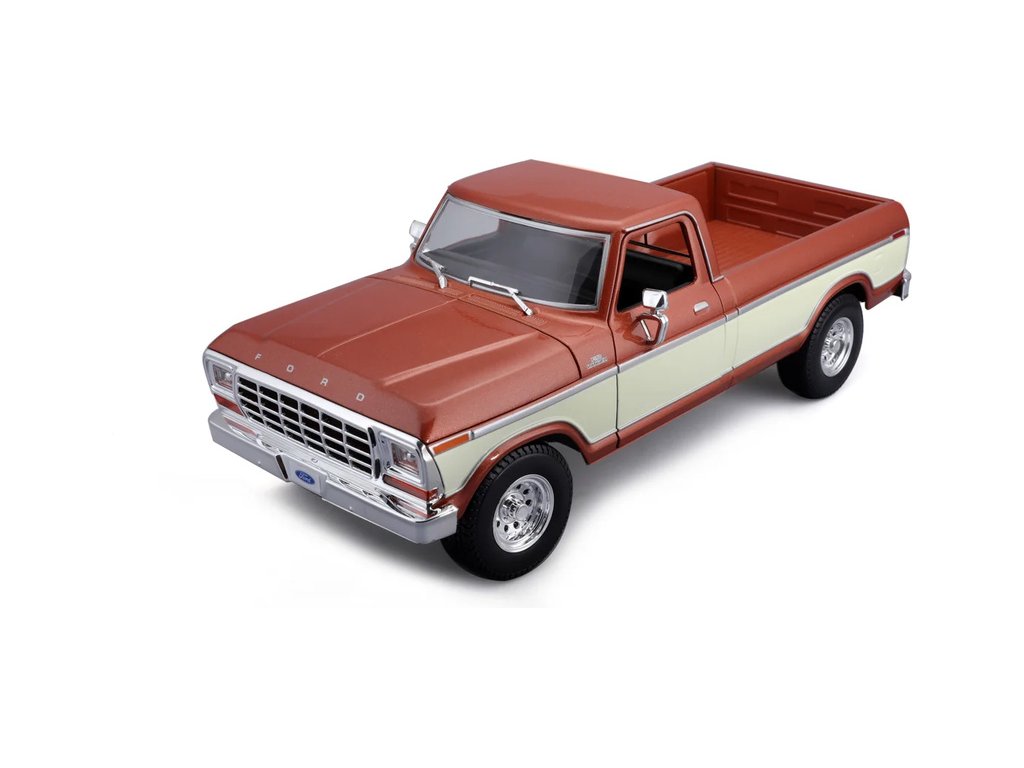 Kovový model auta 1:18 Maisto 31462BR Ford F150 Pick-up 1979 nejen pro sběratele. Model je v detailním provedení a má otevíratelné dveře. Barva modelu je hnědá metalíza a je přibližně 27 cm velký.