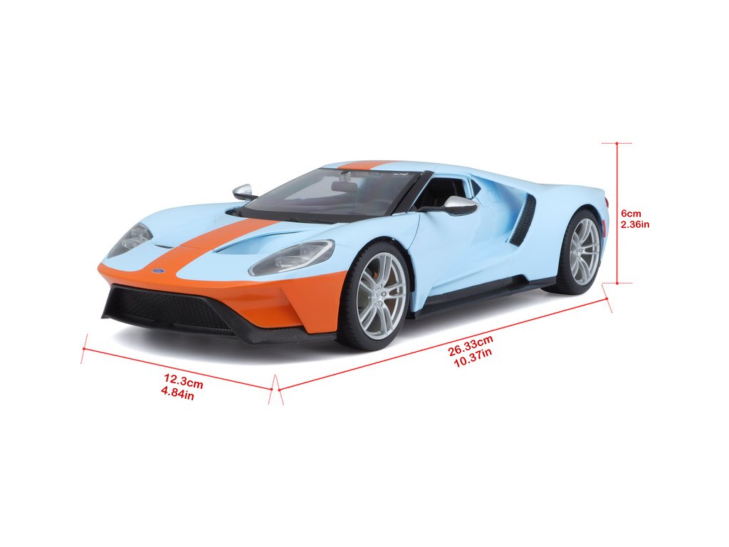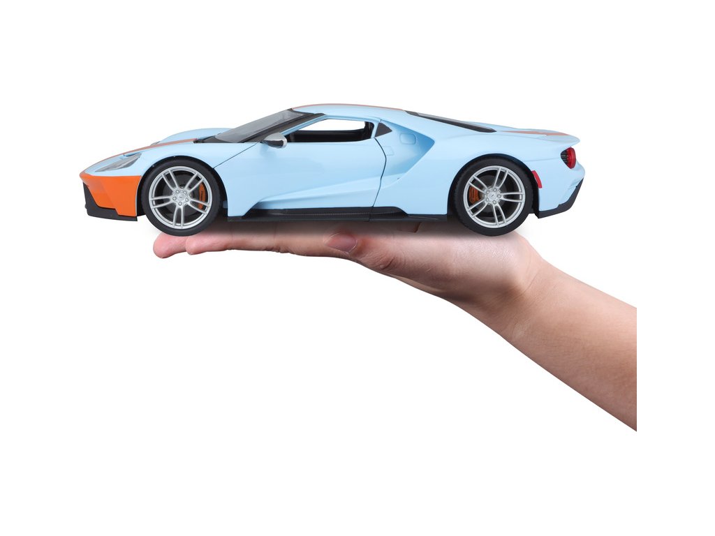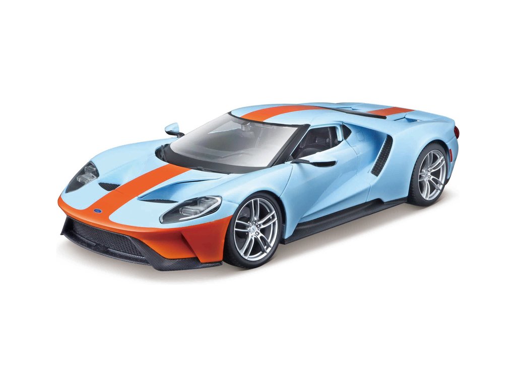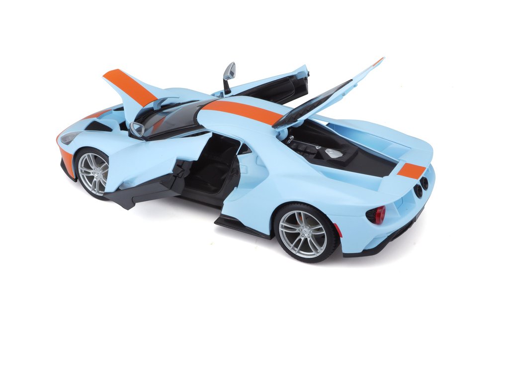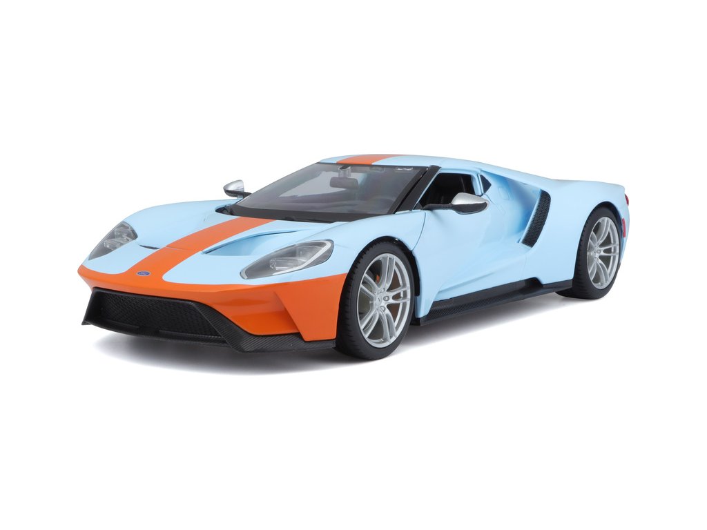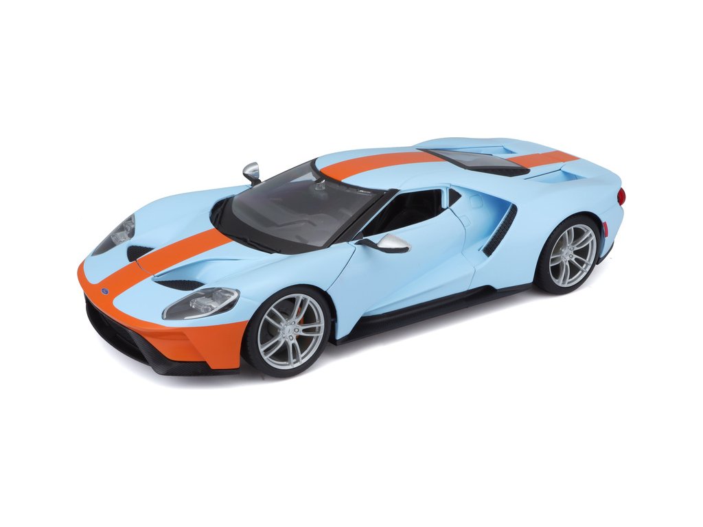 Kovový model auta 1:18 Maisto Ford GT 2017 nejen pro sběratele. Model je v detailním provedení na plastovém podstavci. Barva modelu je modro-oranžová.