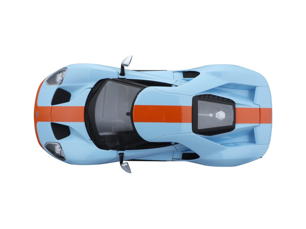 Kovový model auta 1:18 Maisto Ford GT 2017 nejen pro sběratele. Model je v detailním provedení na plastovém podstavci. Barva modelu je modro-oranžová a je přibližně 27 cm velký.