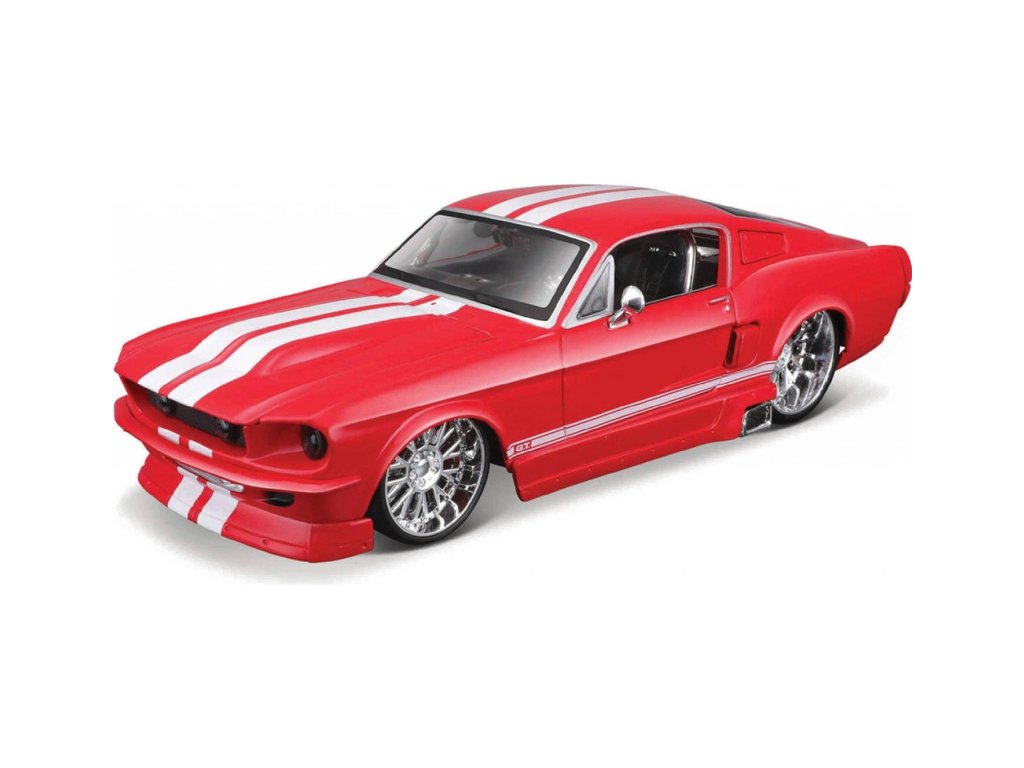 Kovový model auta 1:24 Maisto 31094 Ford Mustang GT 1967 nejen pro sběratele. Model je v detailním provedení a má otevíratelné dveře. Barva modelu je červená a je přibližně 17 cm velký.