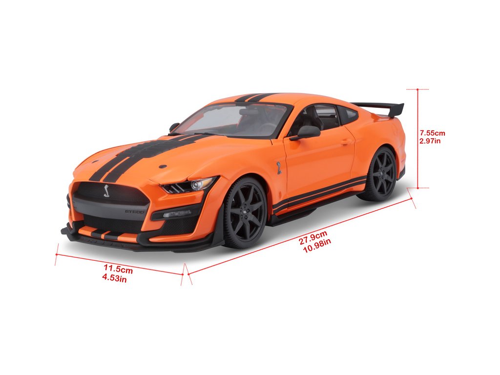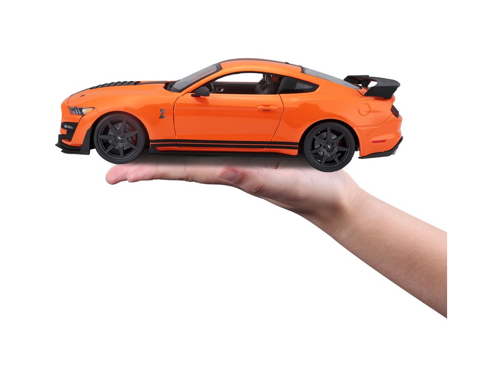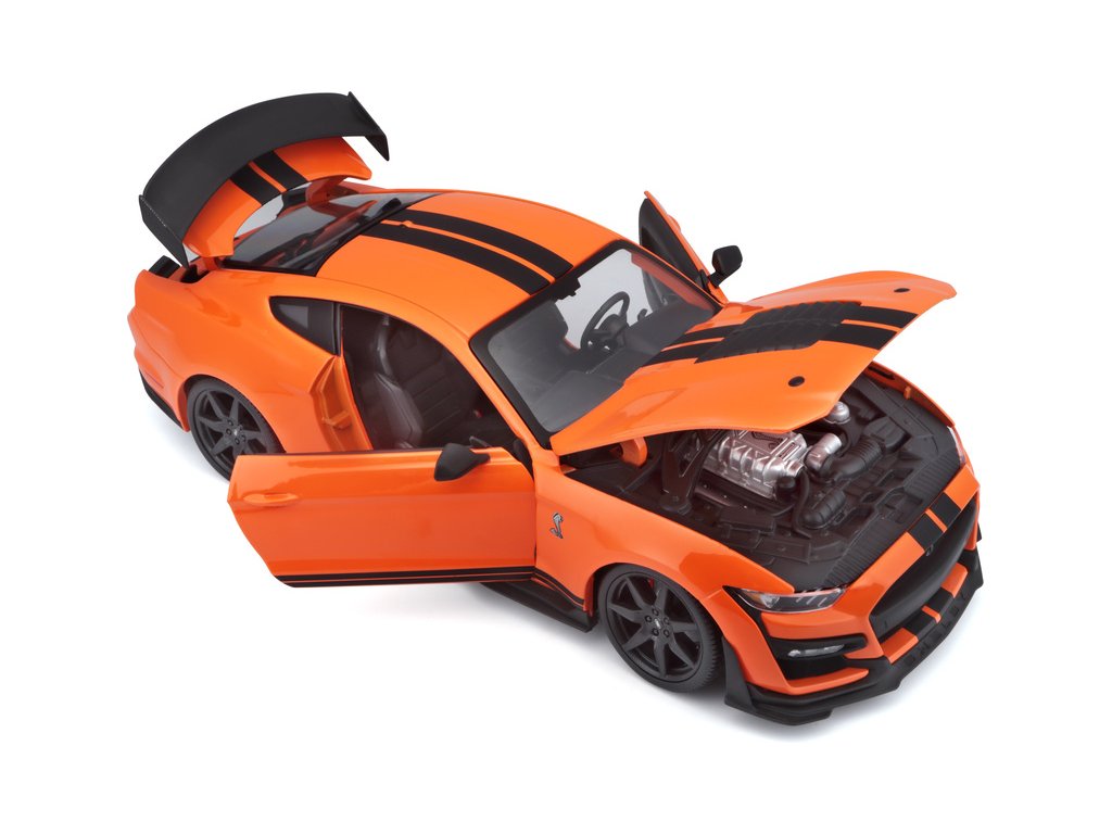 Kovový model auta 1:18 Maisto 31388 Ford Shelby GT500 2020 nejen pro sběratele. Model je v detailním provedení na plastovém podstavci. Barva modelu je oranžová a je přibližně 27 cm velký.
