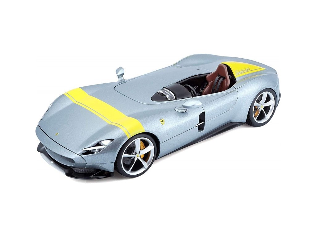 Kovový model auta 1:24 Maisto 39140 Kit Ferrari Monza SP1 nejen pro sběratele. Má otevírací dveře a kapotu. Model je ve verzi Kit určené k sestavení. Barva modelu je stříbrná a je přibližně 18 cm velký.