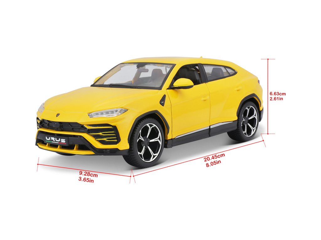 Kovový model auta 1:24 Maisto 31519 Lamborghini Urus nejen pro sběratele. Model je v detailním provedení a má otevíratelné dveře. Barva modelu je žlutá a je přibližně 19 cm velký.