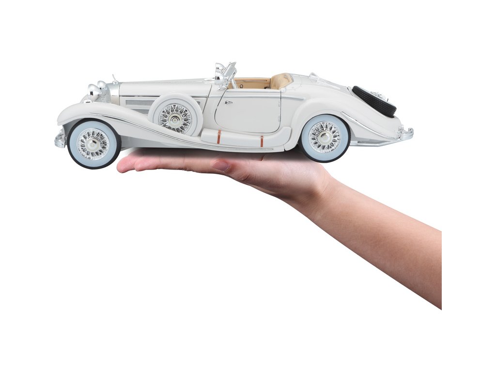Kovový model auta 1:18 Maisto 36055 Mercedes-Benz 500 K Typ Specialroadster 1936 nejen pro sběratele. Model je na plastikovém stojánku v detailním provedení. Barva modelu je bílá.