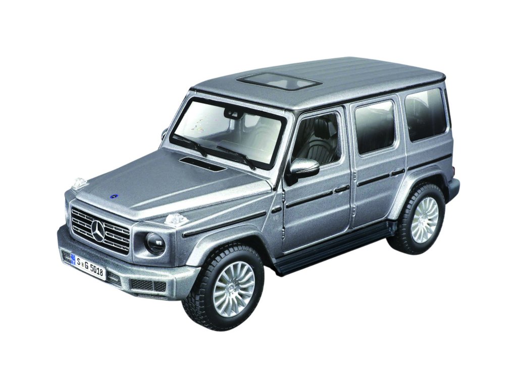 Kovový model auta 1:25 Maisto 39536 Mercedes Benz G Class 2019 nejen pro sběratele. Model je v detailním provedení a má otevíratelné dveře. Model je ve verzi Kit určené k sestavení. Barva modelu je stříbrná a je přibližně 19 cm velký.