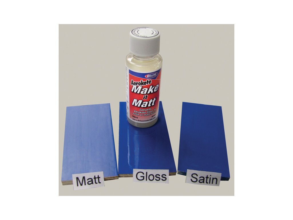 Přípravek Make it Matt slouží pro zmatnění laku Aerokote. Plného matu dosáhnete smícháním laku Aerokote s přípravkem Make it Matt v poměru 1:1. Pololesku dosáhnete poměrem 3:1, polomatu 2:1.