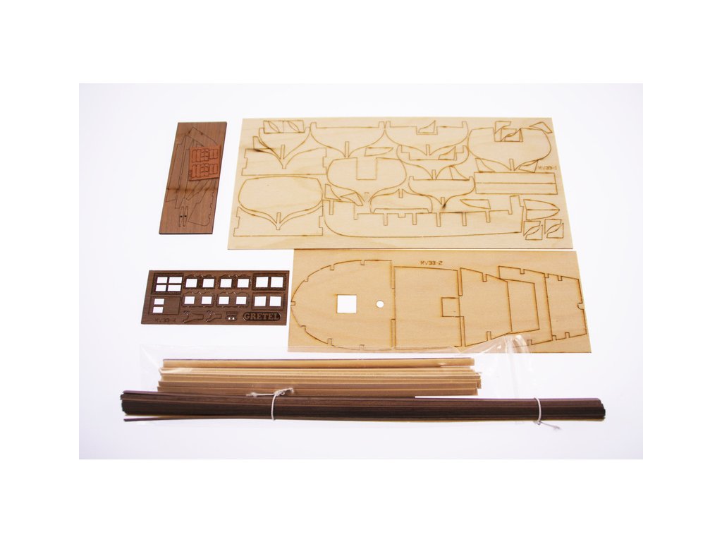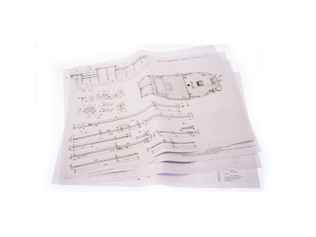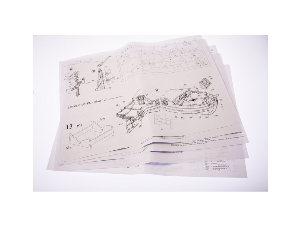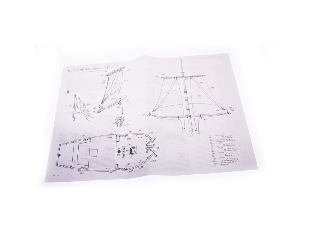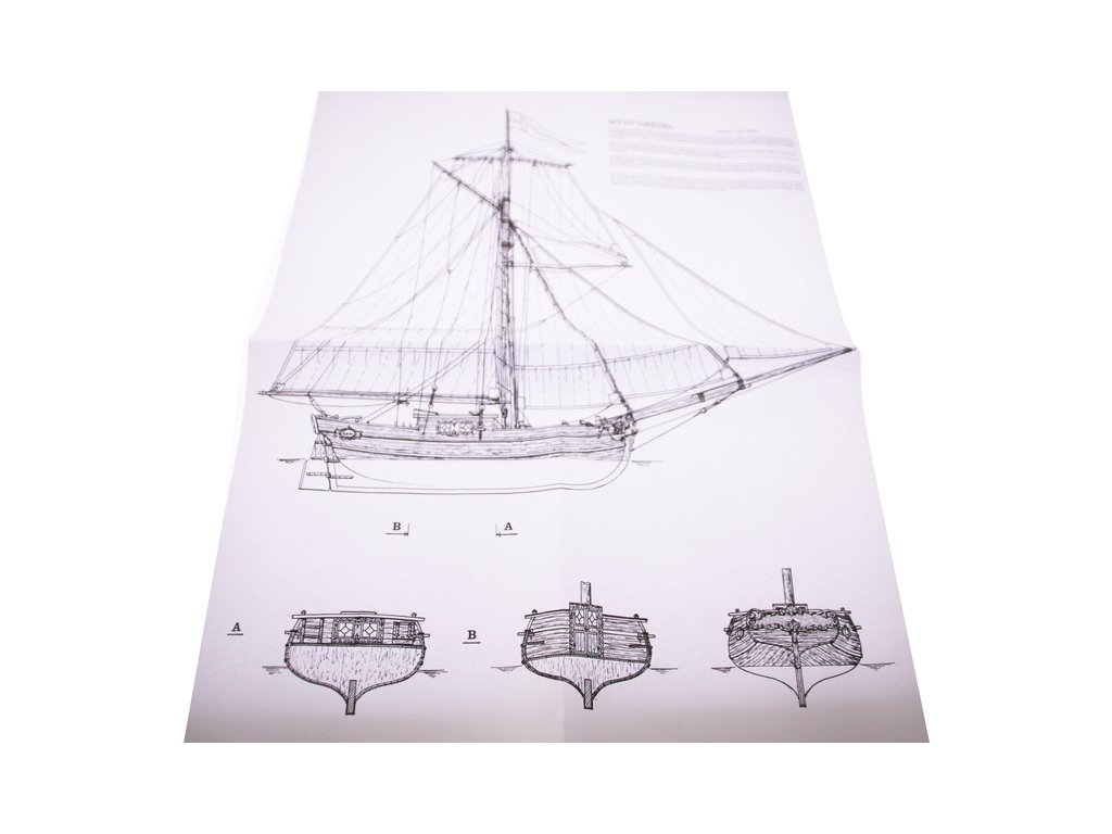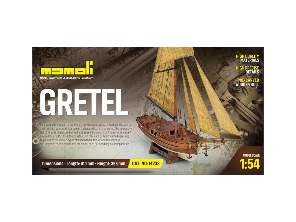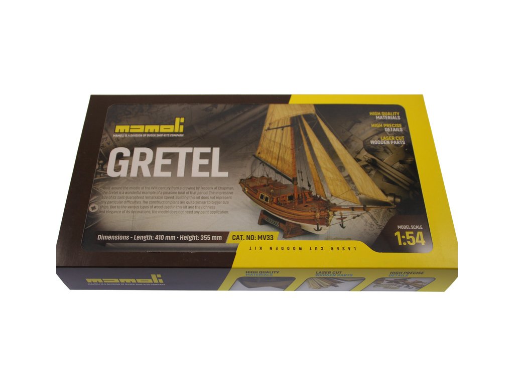Stavebnice neplovoucího modelu MAMOLI Gretel v měřítku 1:54 z poloviny 18. stol. Gretel byla postavena podle plánů Fredrika Af Chapmana a je zvláště úspěšným představitelem výletních plavidel s rysy moderních lodí. V balení jsou dřevěné díly, lišty a množství kování, lanoví, český návod, plány atd.