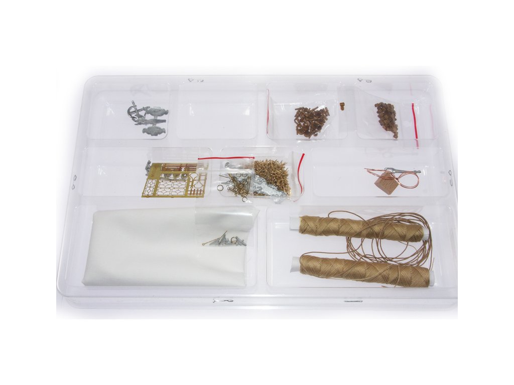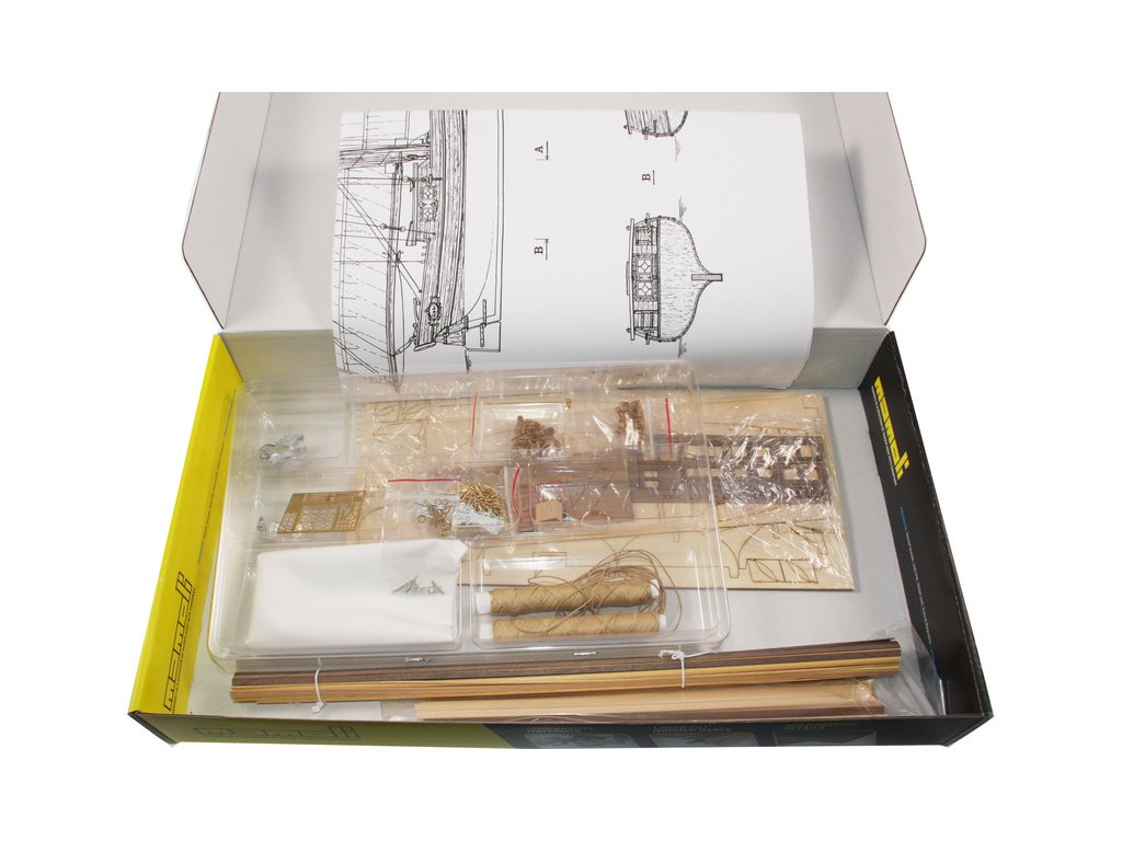 Balení obsahuje hotový polotovar trupu, překližkové díly, dřevěné lišty, blistr s drobnými díly, sadu výkresů, český a vícejazyčný návod.