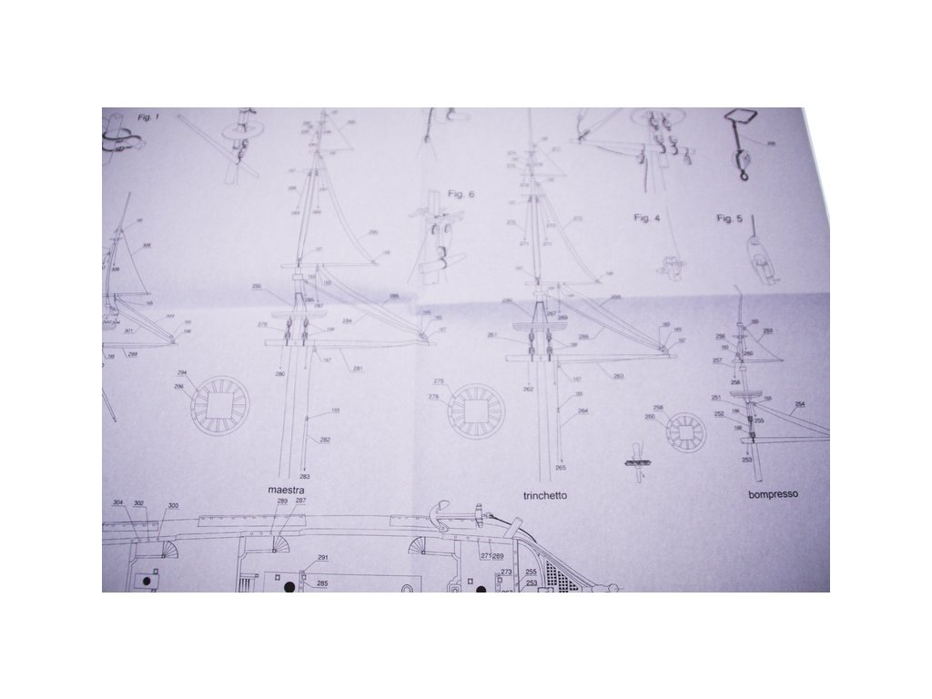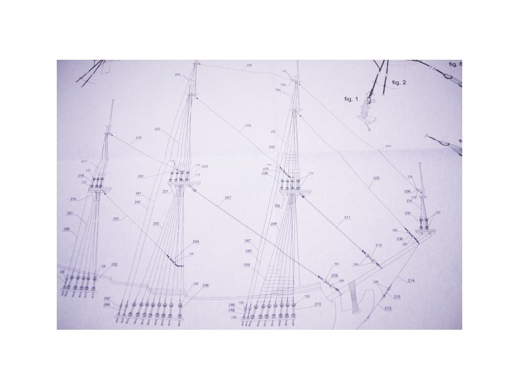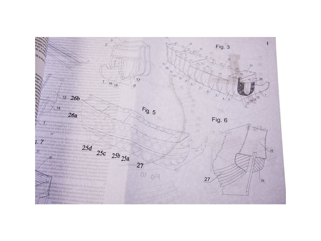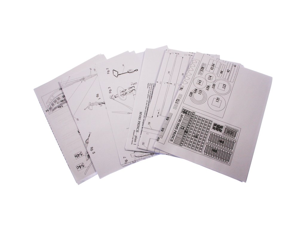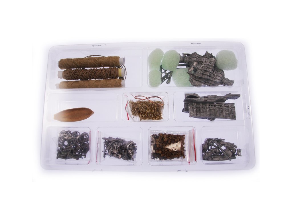 Balení obsahuje sadu překližkových dílů, sadu dřevěných lišt o různém průřezu, blistr s drobnými díly, sadu výkresů a manuál anglický, německý, francouzský a italský.