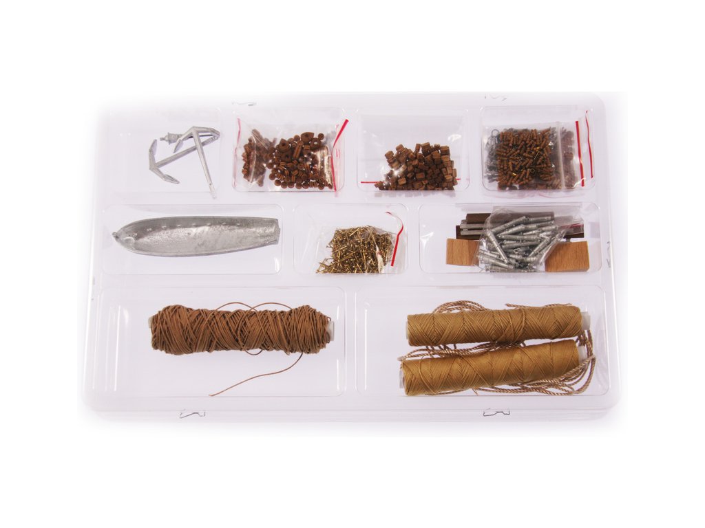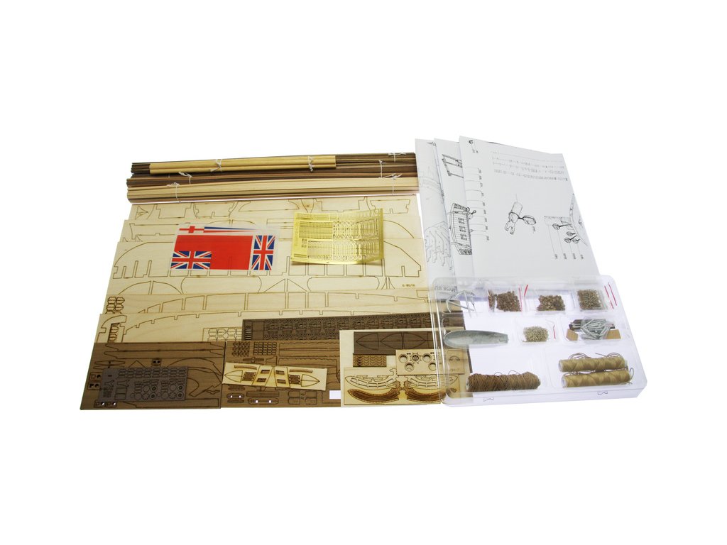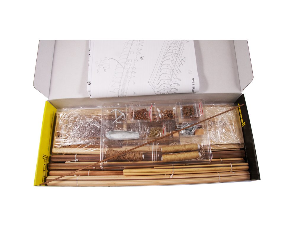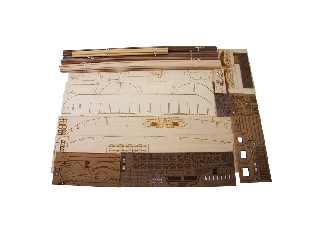 Balení obsahuje sadu překližkových dílů, sadu dřevěných lišt o různém průřezu, sáčky s drobnými díly, díly z mosazi, sadu výkresů a vícejazyčný manuál.