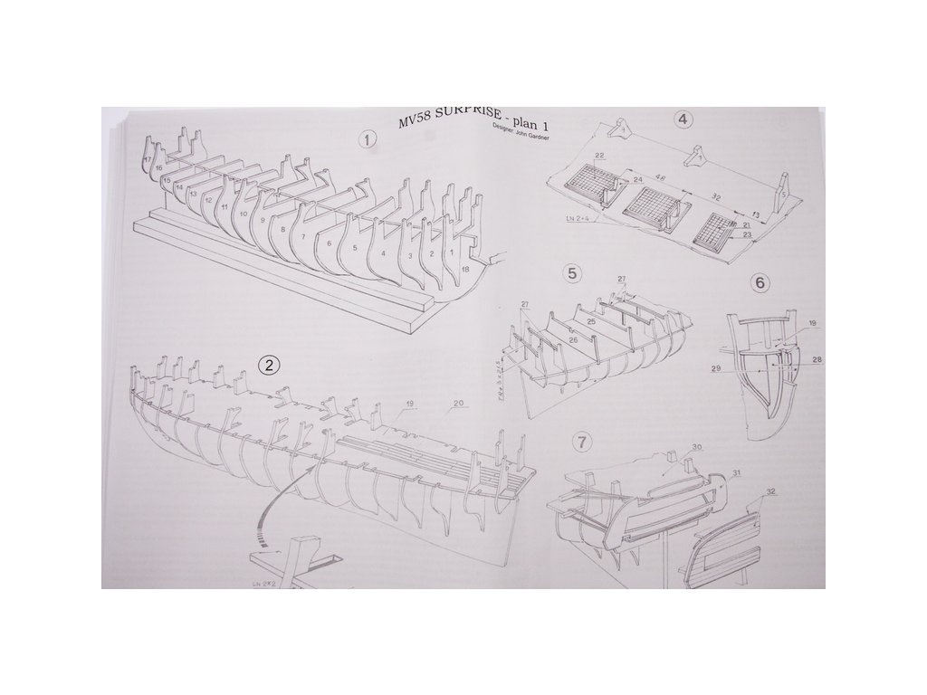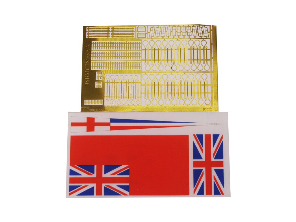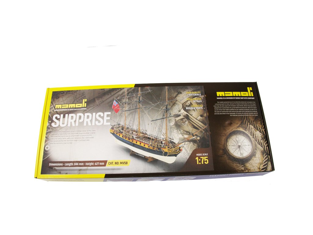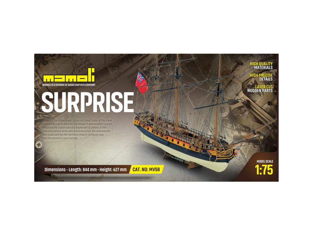 Stavebnice neplovoucího modelu lodi MAMOLI H.M.S. Surprise v měřítku 1:75 z roku 1796. Tato impozantní loď byla původně francouzská korveta. "L'Unité" s 24 děly, pak byla v Anglii změněna na fregatu s 32 děly. V balení jsou dřevěné díly, lišty a množství kování, lanoví, plány atd.