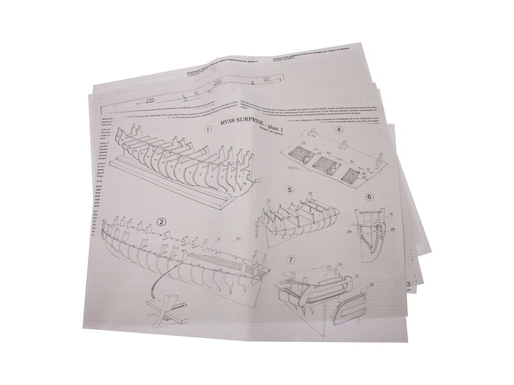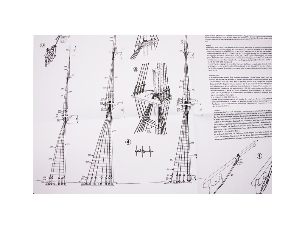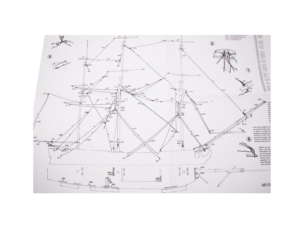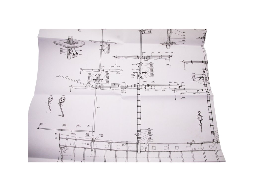 Set obsahuje kompletní sadu výkresové dokumentace modelu v měřítku 1:1 s obrázky jednotlivých detailů. Na výkrese jsou v měřítku nakresleny montážní sestavy, jejich kompletace a to včetně stěžňů a ráhen a způsob vázání lanoví. Vícejazyčný postup stavby rámcově upravuje logické sestavení jednotlivých komponentů.
