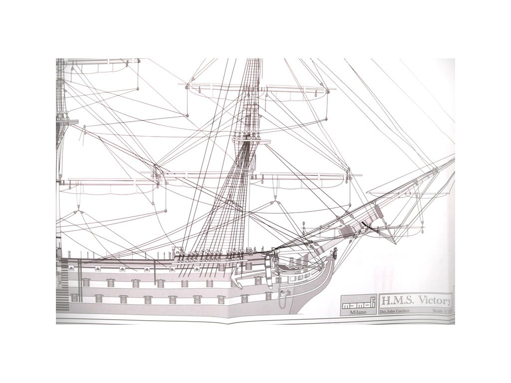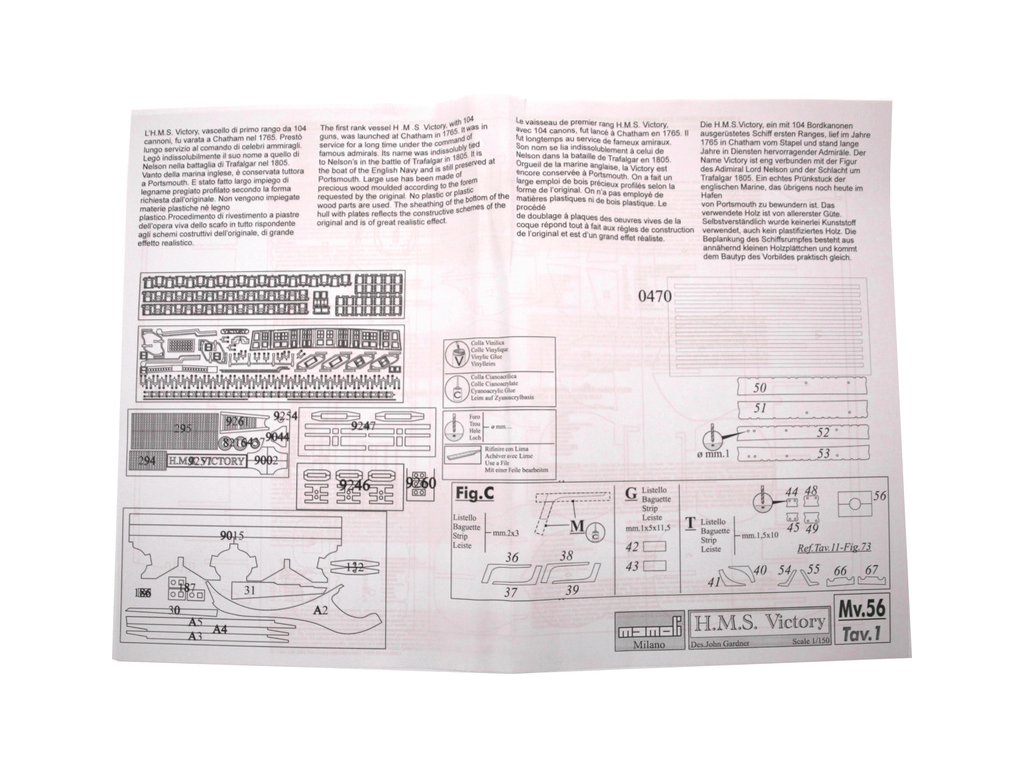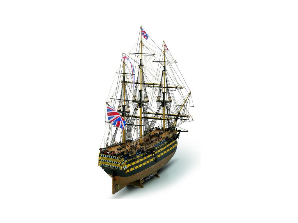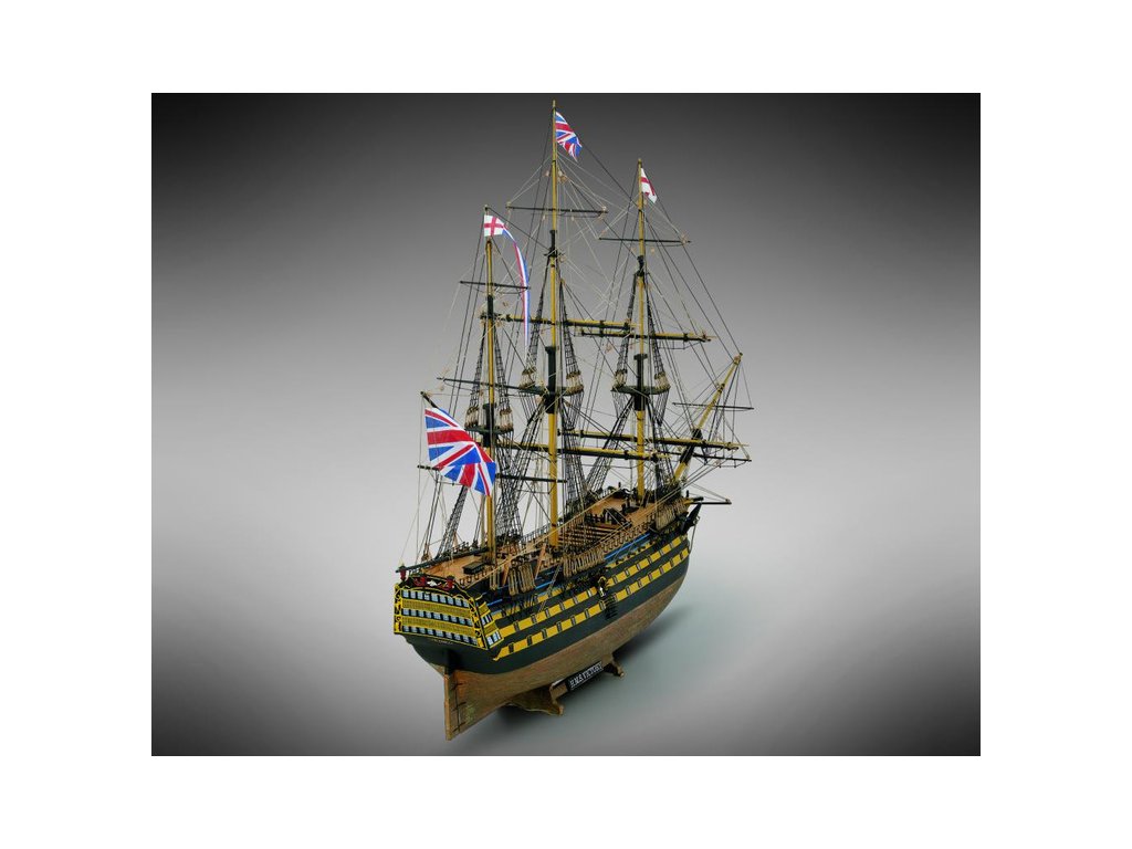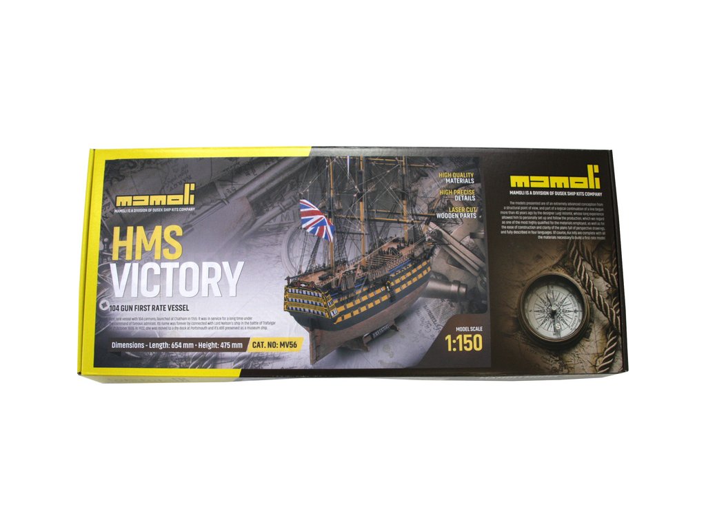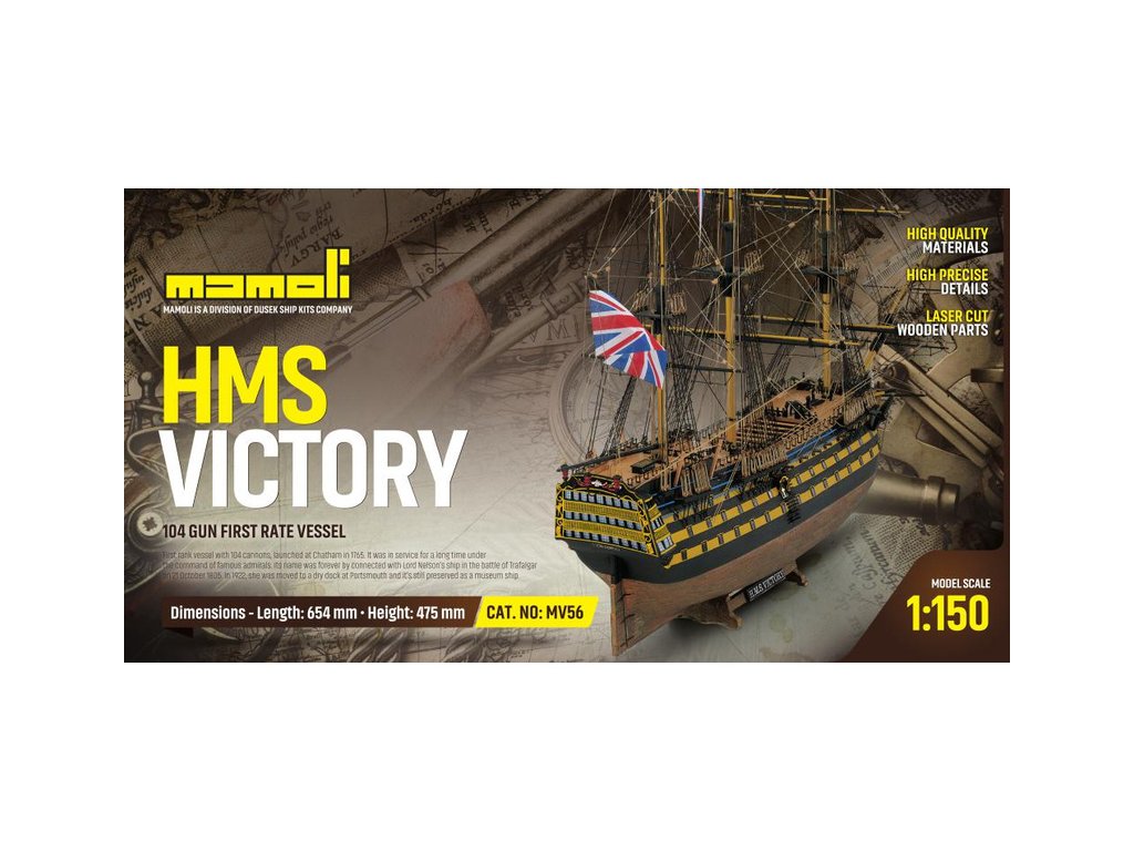 Stavebnice neplovoucího modelu MAMOLI H.M.S. Victory v měřítku 1:150 z roku 1765. Stala se slavnou, když se 21. října 1805 zúčastnila jako vlajková loď admirála Nelsona v bitvě u Trafalgaru, ve které Angličané porazili francouzsko-španělskou flotilu. Délka 564mm, výška 475mm Dnes je pyšná loď plně obnovena, sedí na suchém doku a slouží jako památník na britskou námořní chloubu. V balení jsou dřevěné díly, lišty a množství kování, příslušenství, velké stavební plány v měřítku 1: 1 a mnoho perspektivních výkresů usnadňují montáž. Určeno pro zkušené modeláře.