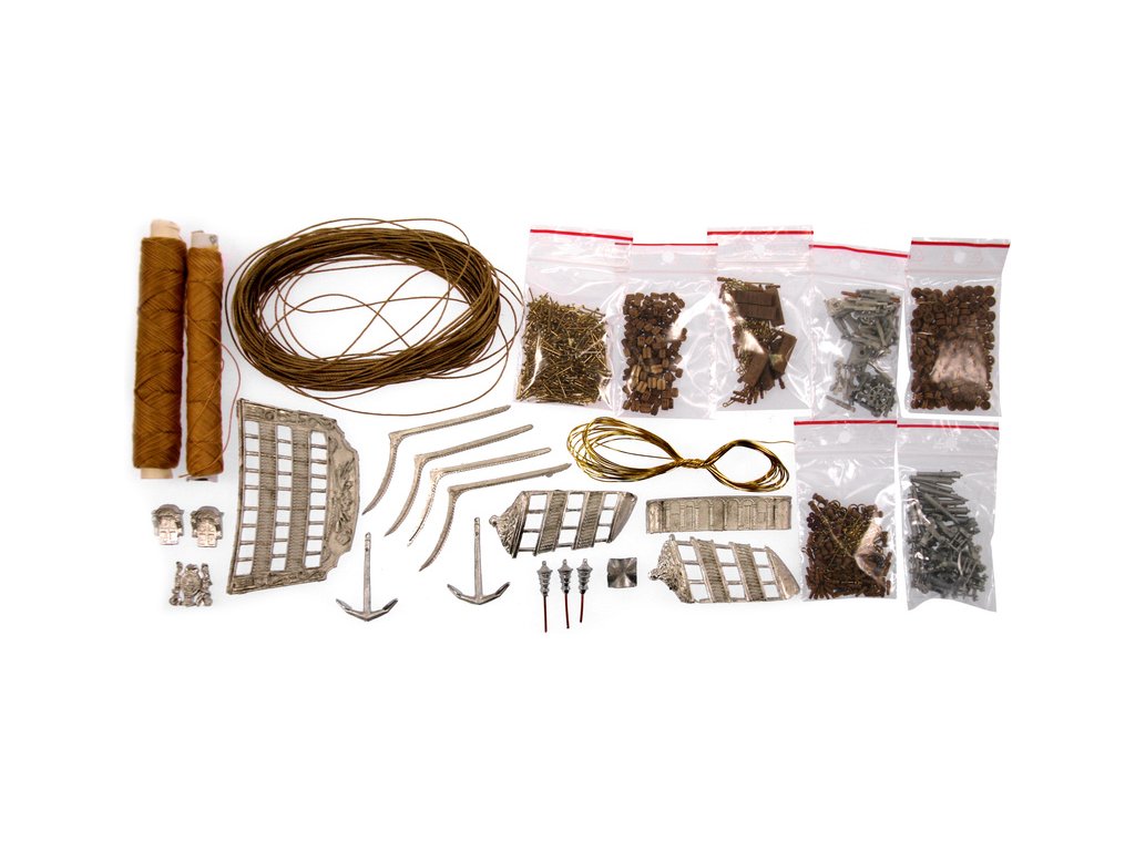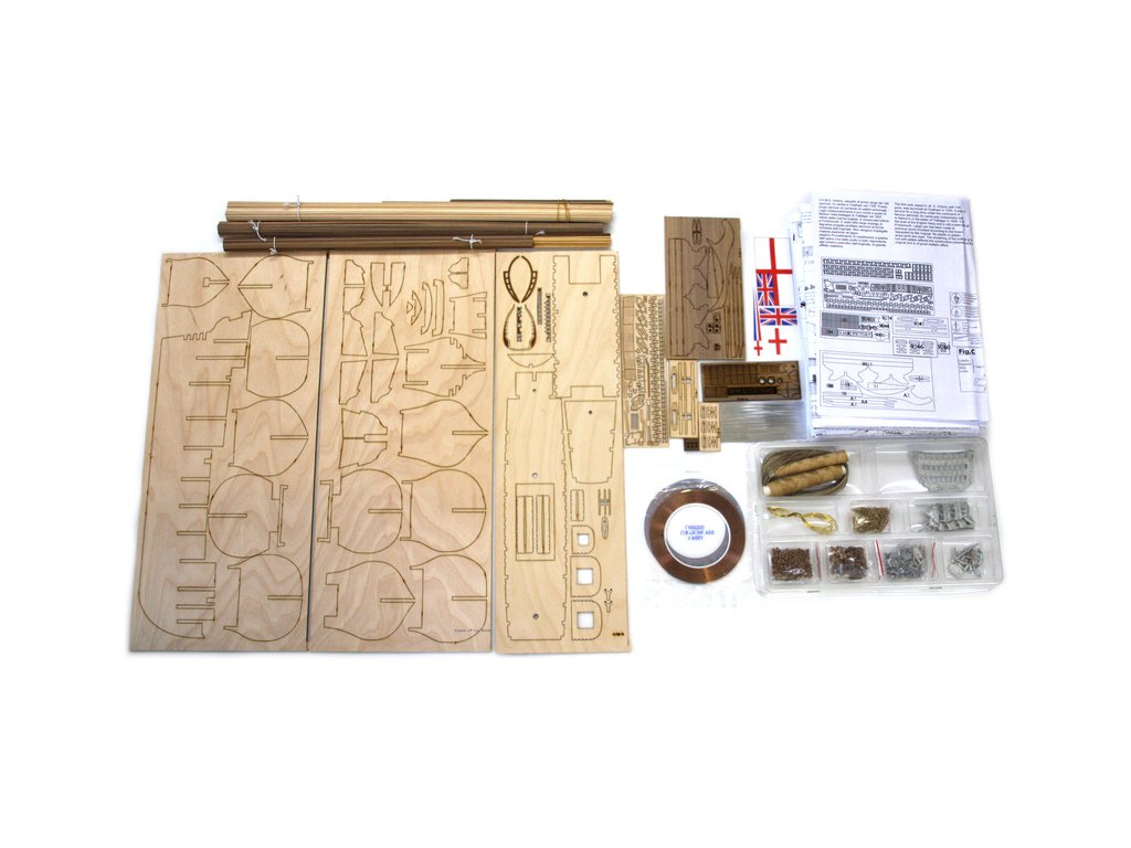 Balení obsahuje sadu překližkových dílů, dřevěných lišty, kovové odlitky, kovové destičky, lanoví, maketové doplňky, vlajky, sadu výkresů a manuál EN, DE, FR a IT.
