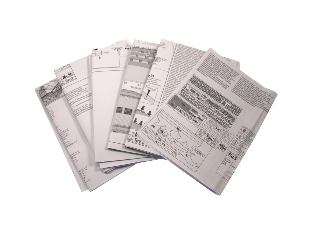 Set obsahuje kompletní sadu výkresové dokumentace modelu v měřítku 1:1 s postupem stavby, na výkrese jsou pečlivě označeny díly a je zde i seznam jednotlivých součástí modelu.