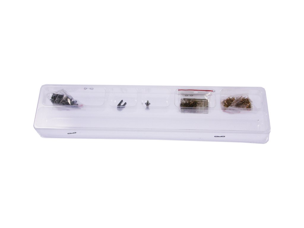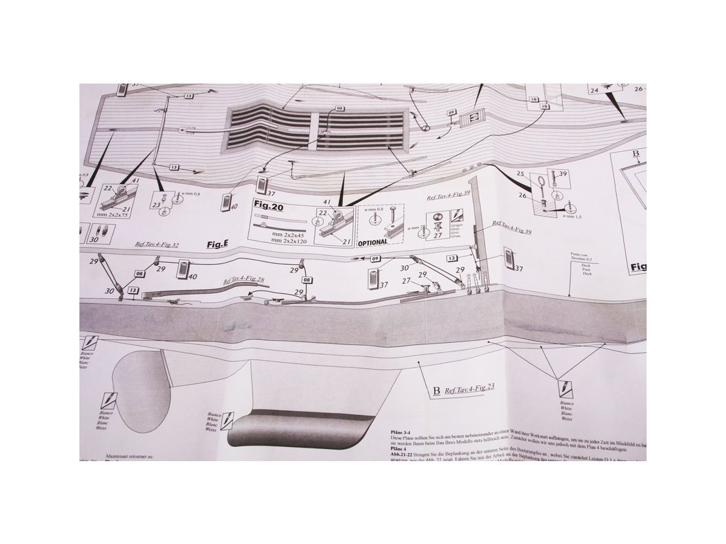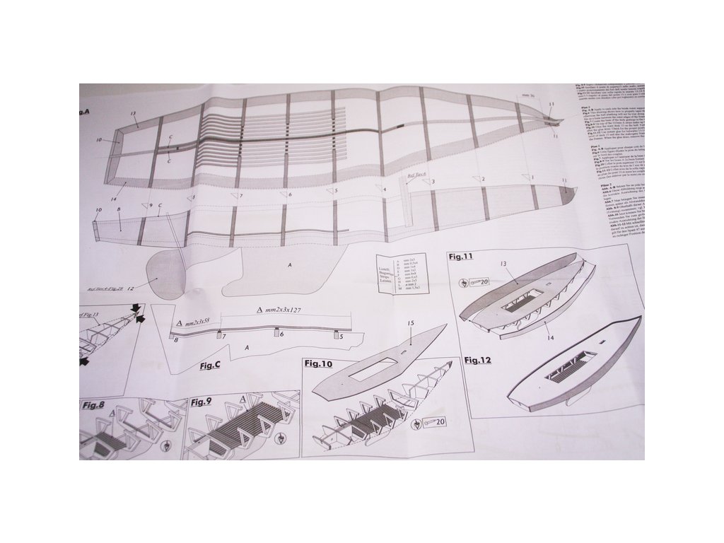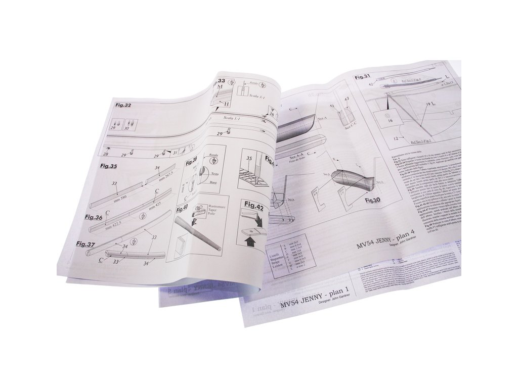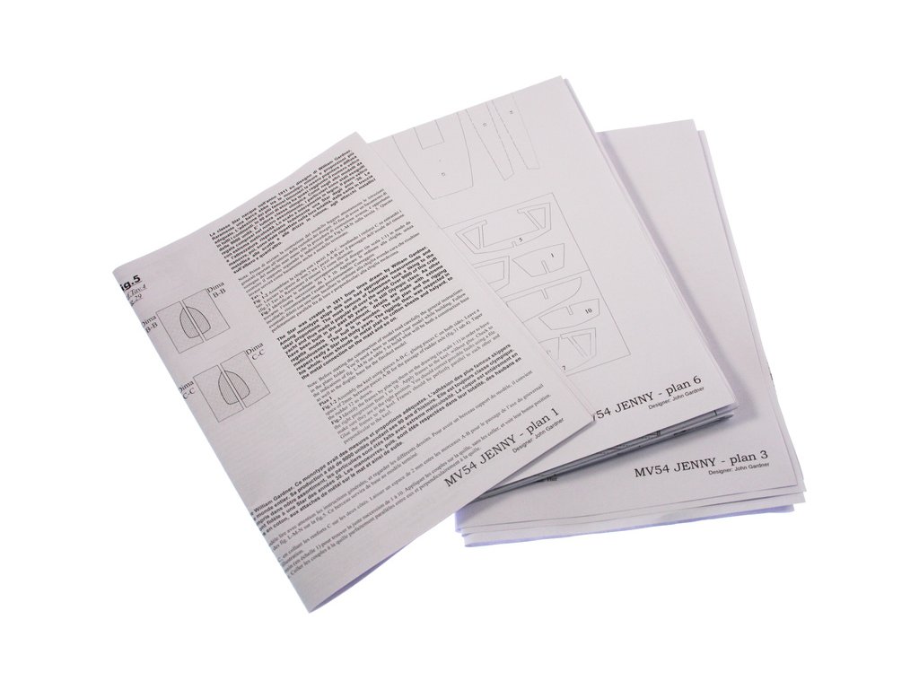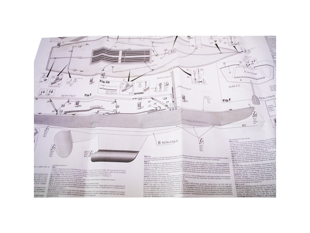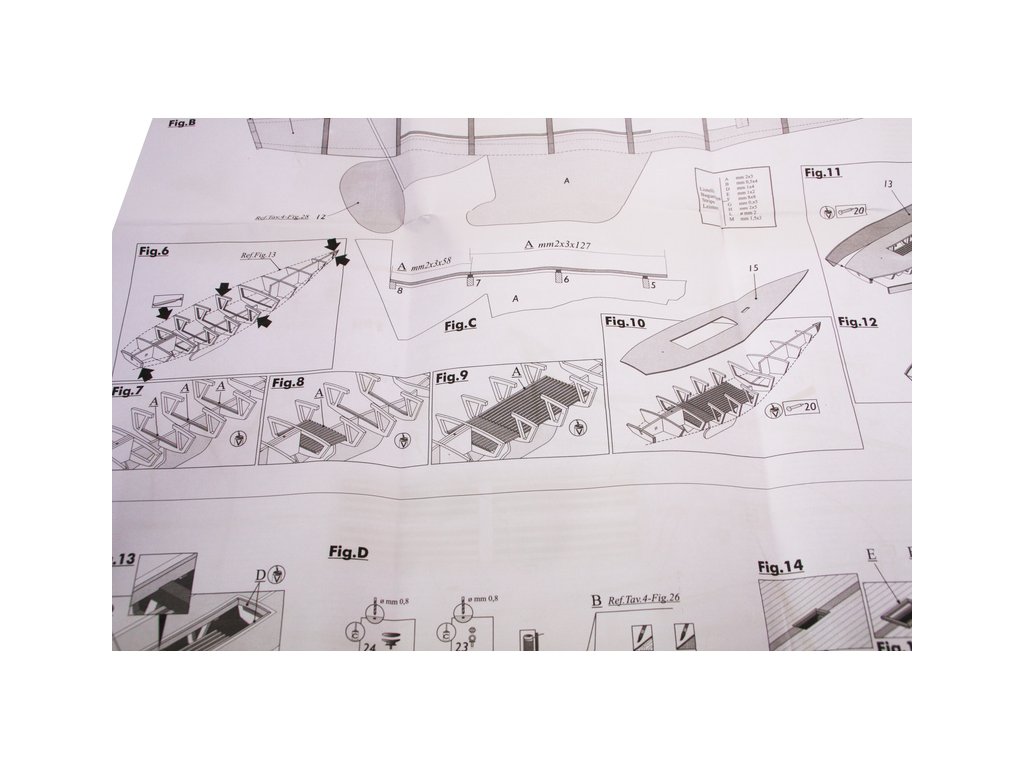 Balení obsahuje sadu překližkových dílů, sadu dřevěných lišt o různém průřezu, blistr s drobnými díly, sadu výkresů a manuál anglický, německý, francouzský a italský.