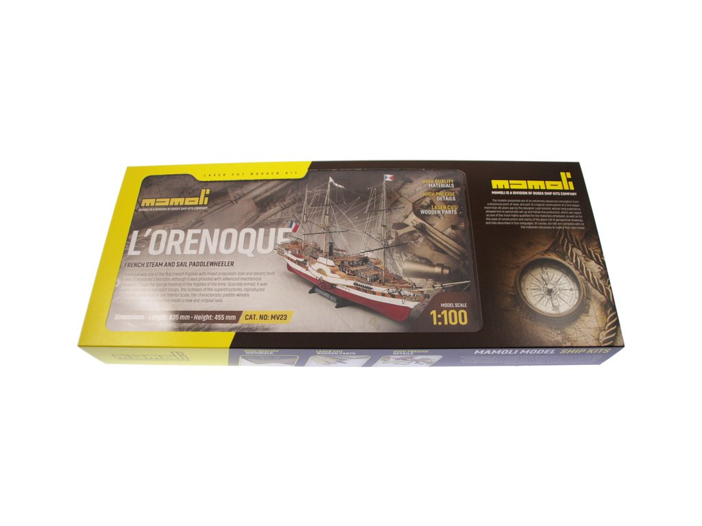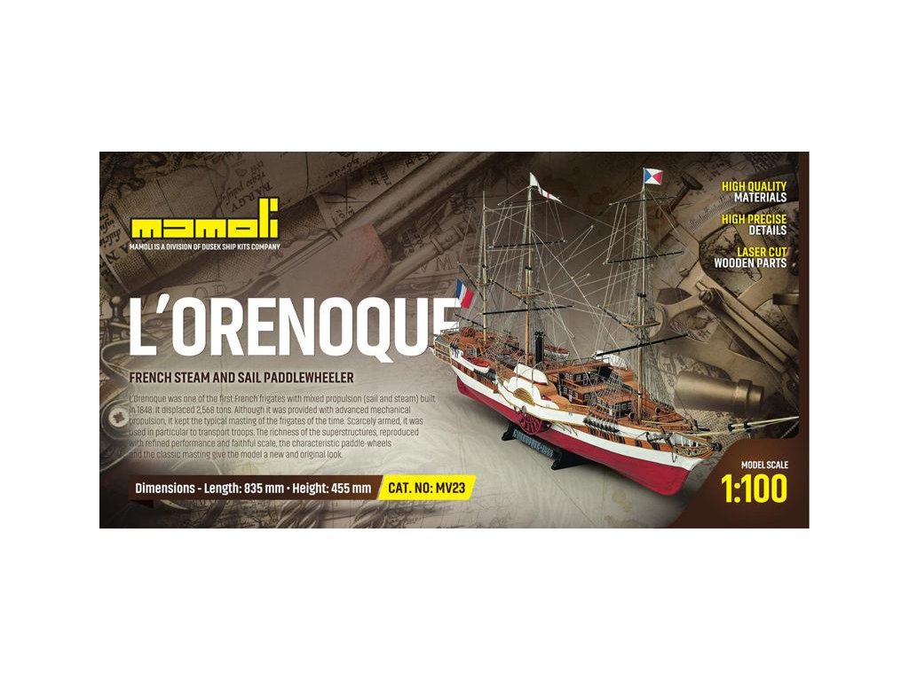 Stavebnice dřevěné statické makety historické lodi MAMOLI L'Orenoque z roku 1848 v měřítku 1:100 kit. Loď L'Orenoque byla první francouzskou fregatou se smíšeným pohonem plachty-pára, měla typickou stožárovou konstrukci fregat z tohoto období. Byla používána zejména k přepravě vojáků.Výtlak 2568 tun.