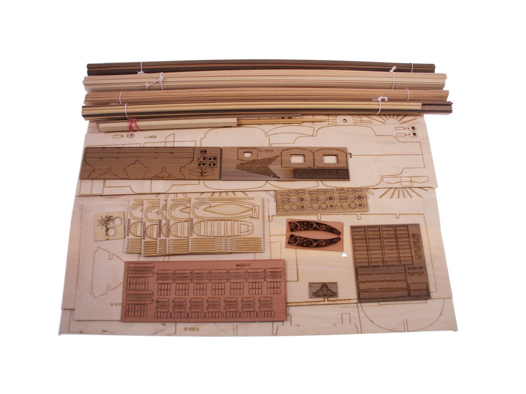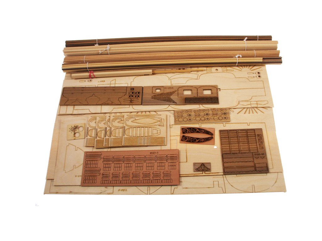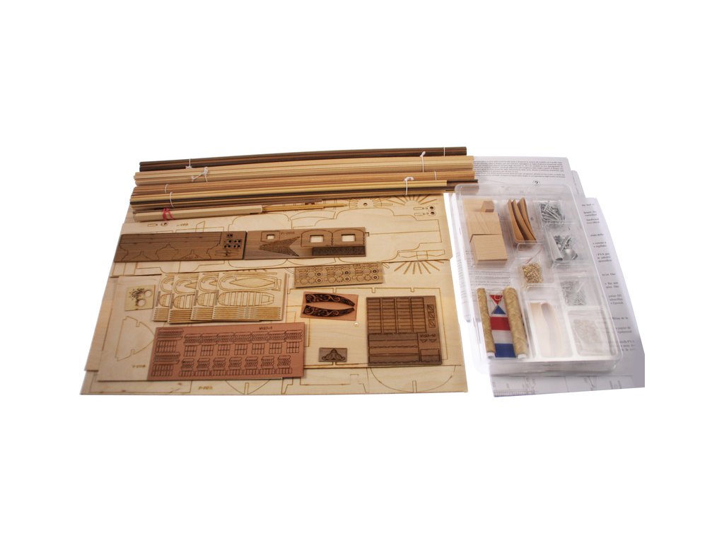 Balení obsahuje sadu překližkových dílů, sadu dřevěných lišt o různém průřezu, blistr s drobnými díly, sadu výkresů a manuál.